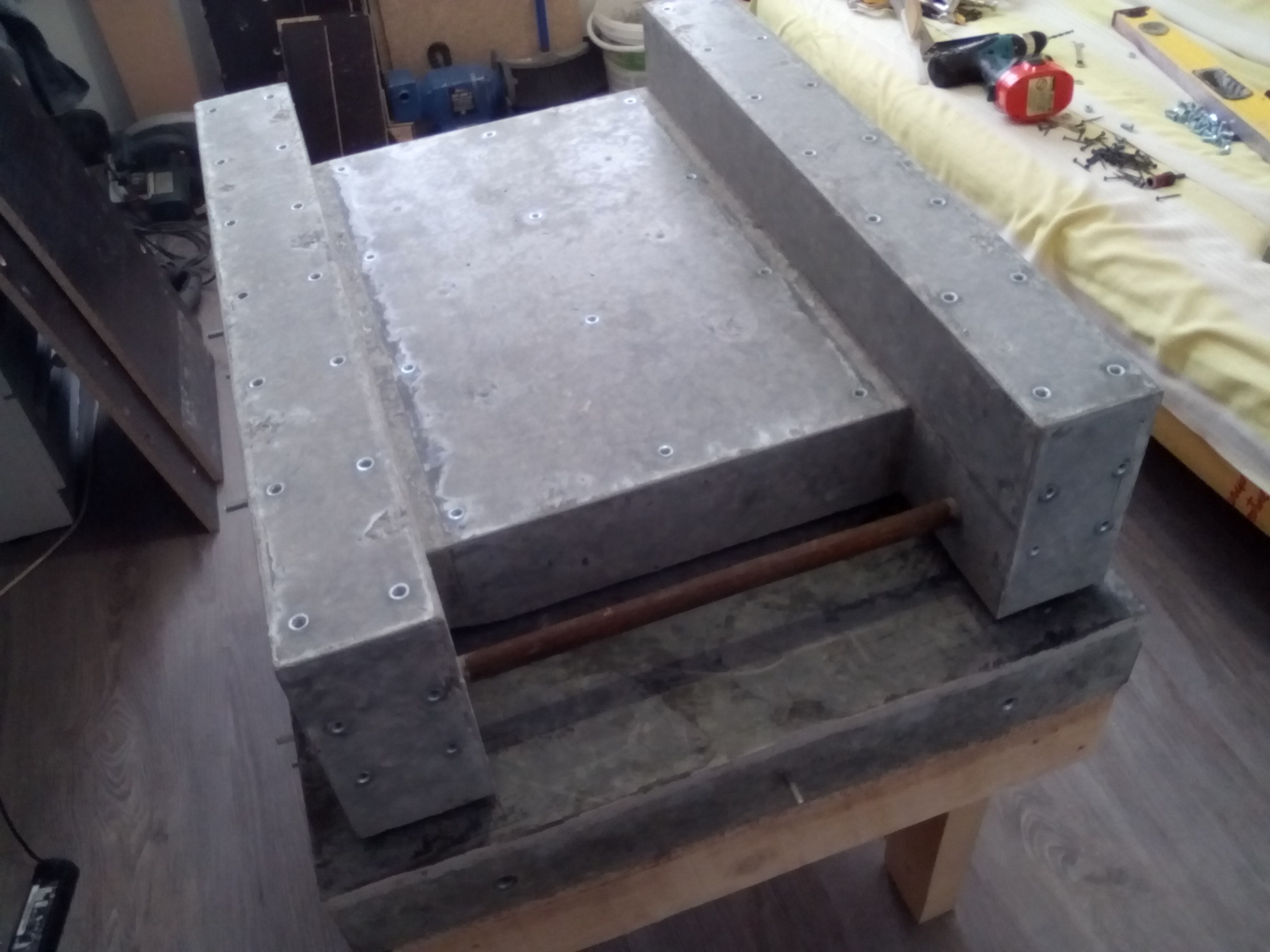 Думаю, что обыкновенный бетон проигрывает полимерному не так сильно, чтобы отрицать его применимость в качестве материала для станины хоббийного станка. Может, если с этим проектом все будет хорошо, в другой раз дорОсту до полимербетона)
