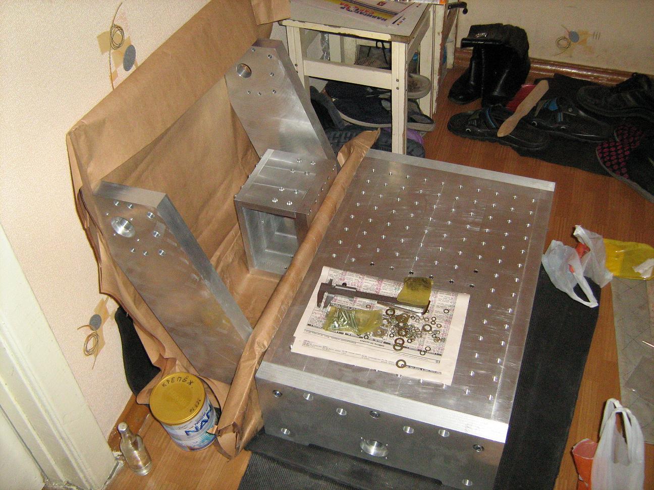 рельсы, движки заказывал у китайцев, швп (sfu1204, около 5000 выйдет на все оси + 3 гайки) планирую там же. Обработкой дюралек занимался сам, т.к. на чпу центре работаю и как бы специальность основная фрезеровщик. Сейчас пока привёз домой стол, фотки его и выкладываю ниже, позже будут остальные и процесс сборки. Расход будет 129(z) х 275(у) х 405(x). Вес в солиде считал, стол 40,5 кг (что вроде похоже, на 5 этаж без лифта пёр один). Полный вес только дюрали около 100 кг.