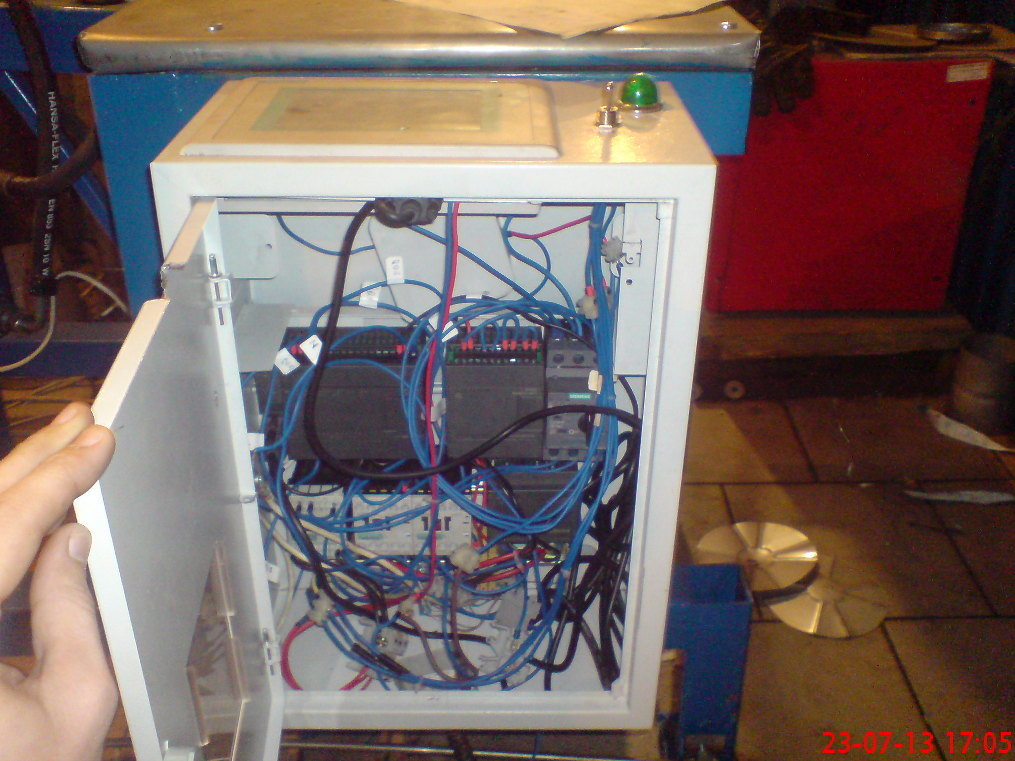 ЦПУ использовал SIEMENS Simatic S7-200, cpu 224 AC/DC/Rly (заказной номер 6ES7 214-1BD23-0XB0), к нему подключен шлейфом модуль аналоговоых входов/выходов ANALOG I/O EM 235, FOR S7-22X CPU (6ES7235-0KD22-0XA0), который купленный сначала оригинальный сименс успешно отдал свою кремниево-пластиковую душу и был заменен на его копию фирмы Kollewin Technology Co.,Limited, шел к нам с китая 16 дней и ура! - работает (значительно дешевле оригинала). HMI Тач скрин использовал SIMATIC TP177B 6" DP (6AV6642-0BC01-1AX1), хотя можно наверняка другой использовать, только нужно что бы он был совместим с s7-200. Прогу для HMI рисовал на WINCC FLEX 2005 Adv. (файл ww6_punish.rar). Для заливки проги на s7-200 использовал обычный rs485toUSB конвертер фирмы Монтел-Рек (но уверен что подойдет любой на MAX232) и разъема DB9 с распновкой (DB9 <---> RS485toUSB) 3 - А, 8 - B, 1 - земля. Программа для s7-200 файл main.rar. Если кого будут интересовать значения переменных, при написании своей проги для HMI - пишите в личку.