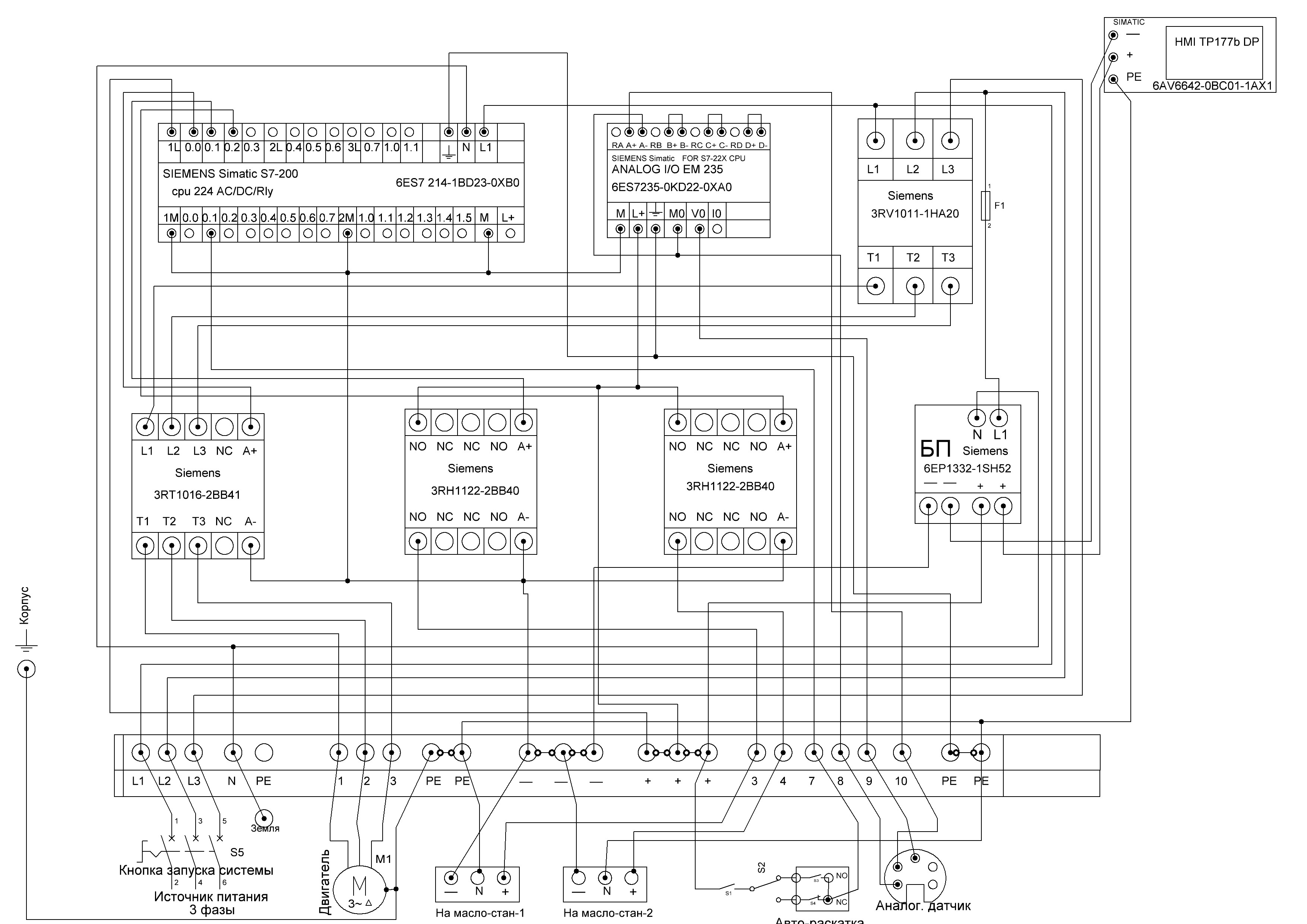Значения на рисунке: Пускатель - Siemens 3RV1011-1HA20(можно аналогичный), Контактор 1 - 3RT1016-2BB41, Контактор 2 и 3 - 3RH1122-2BB40. Блок питания - 6EP1332-1SH52 in 110/220V out 24V.