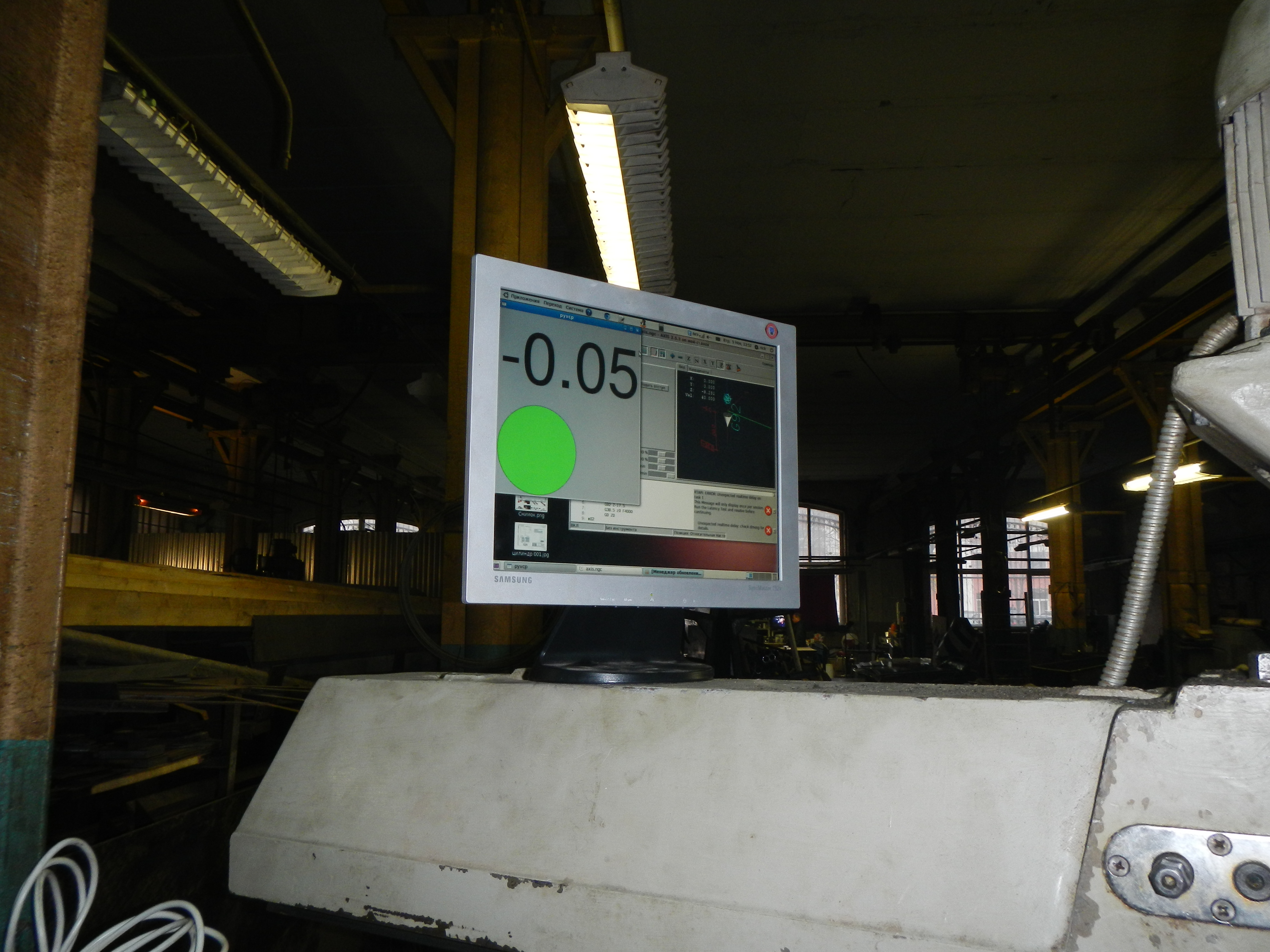 На экране linuxcnc с панелькой pyvcp, на ней отображается перемещение по модулю 9,5мм и зеленый светодиод, который сигнализирует, что можно сверлить (+-.2 мм)