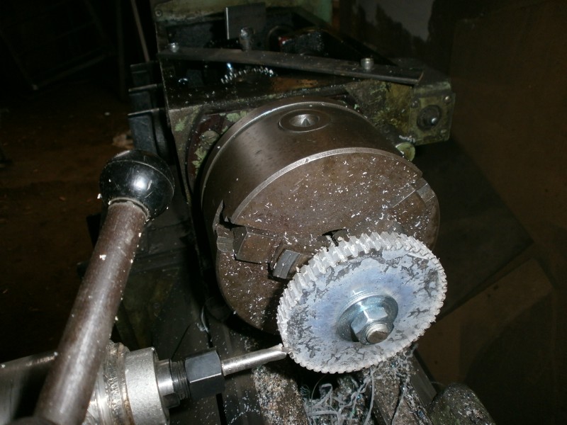 Режет зуб за один проход. с хорошим качеством поверхности. Сделал приспособу для крепления фрезера вместо резцедержателя С диаметром конечно промахнулся, т.к. формул расчета шестерен под зубчатый ремень не удалось, думаю со следующей угадаю.