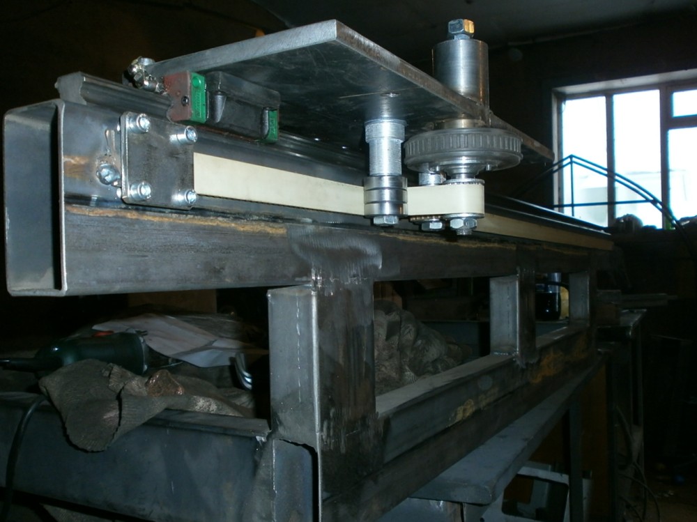 Собственно рельсы уже закреплены и полупортал уже собран и опробован на перемещение. (правда только на двух каретках, денег пока нету), все устраивает, катается легко, есть возможность регулировки перпендикулярности осей.