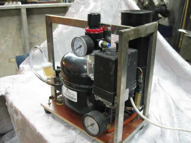 основа компрессор от охладителя воды, регулятор держит давление в рессивере 10 атм.