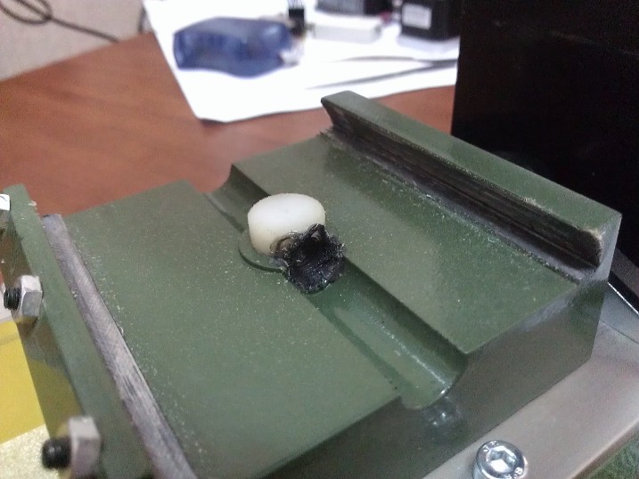 И близко бронзой не пахнет, вот гайка которой прикручена ось X Сейчас решил заодно посмотреть за что винт оси X цепляется, что-бы двигать стол:Nick писал(а):А из чего гайки? Бронзовые? Слышал, что у них вроде крепление не ахти какое.