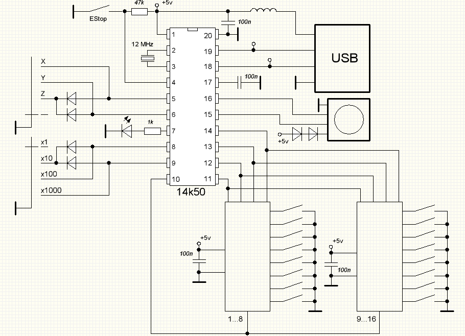 Всего можно будет подключить до 16 кнопок, два галетных переключателя (для выбора осей и скорости подачи) и, собственно, сам энкодер.