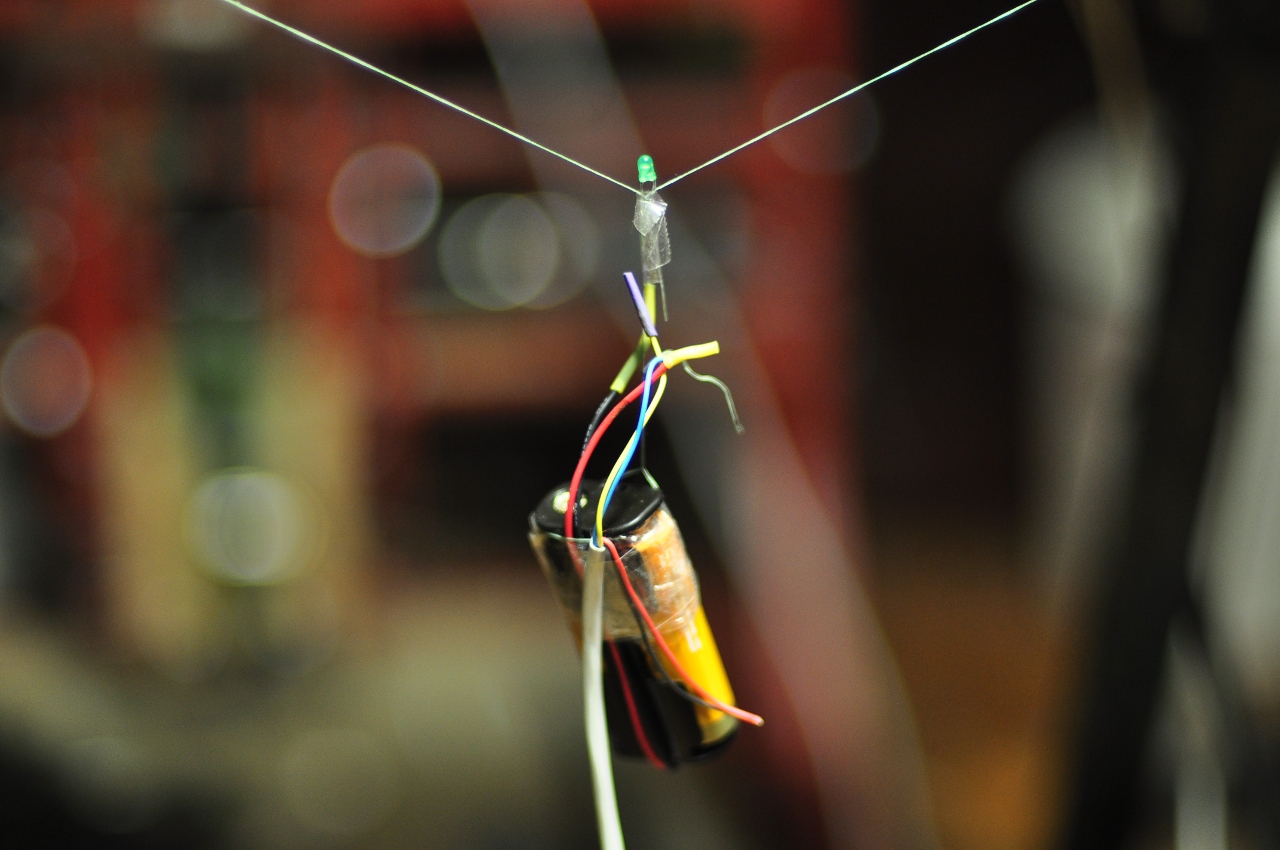 На видео ничего не видно будет, я в темноте снимал. Но фактически просто ездит в воздухе на двух веревочках батарейка...