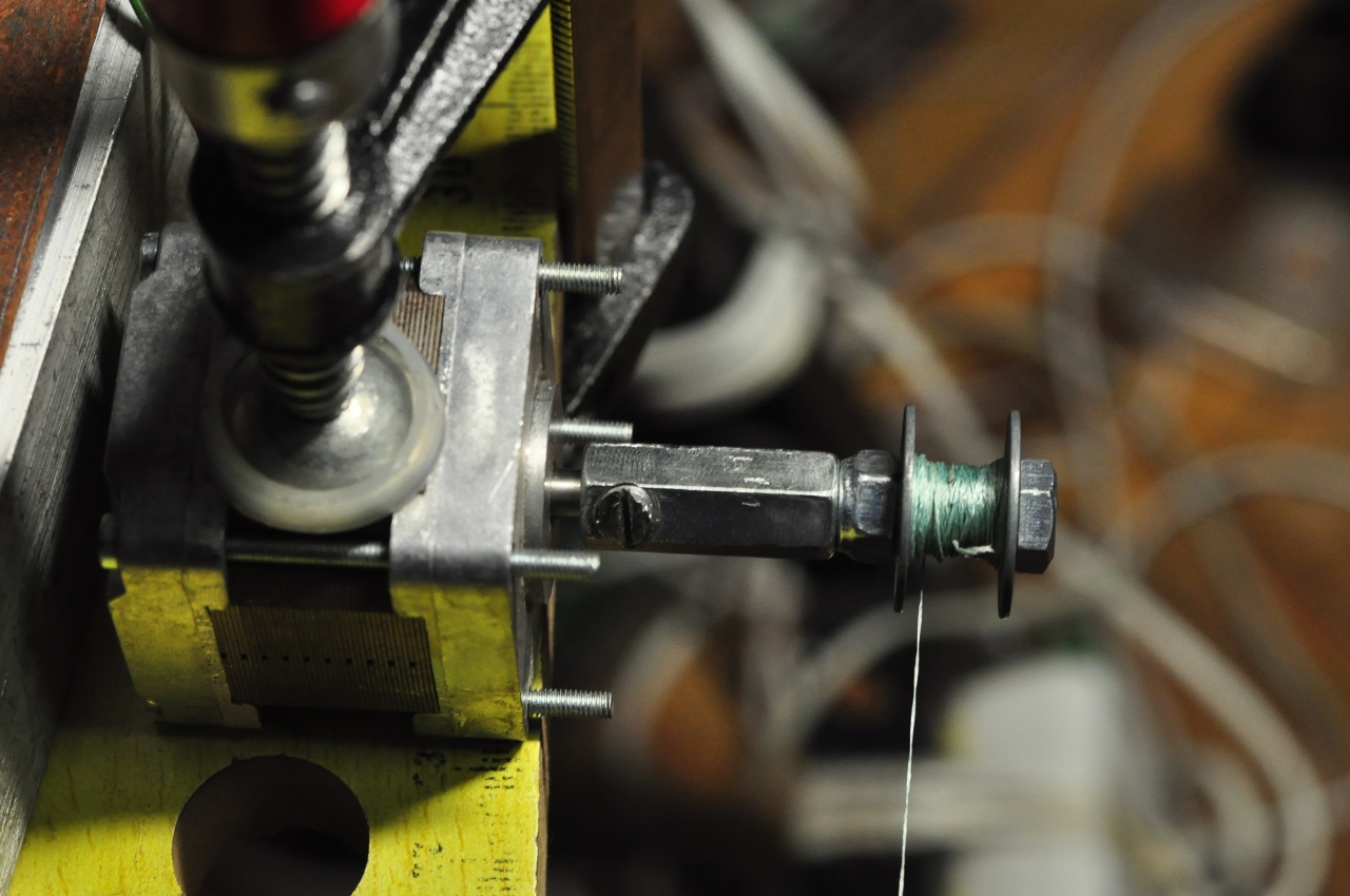 На вал двигателя я установил катушки. Шпуля взята от швейной машинки, вместо муфты используется удлиненная гайка М6. На вале двигателя гайка крепится при помощи винта, для этого нужно просверлить поперечное отверстие и нарезать в нем резьбу. Шпуля же крепится на оси другого винта, который закручивается прямо в удлиненную гайку.