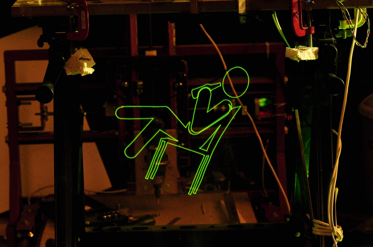 Картинка фиксируется фотоаппаратом, с установленной длительной экспозицией (режим Bulb). Я использовал пульт дистанционного управления, который по случаю приобрел за 300р. Вот такие получились первые рисунки на граффити роботе: