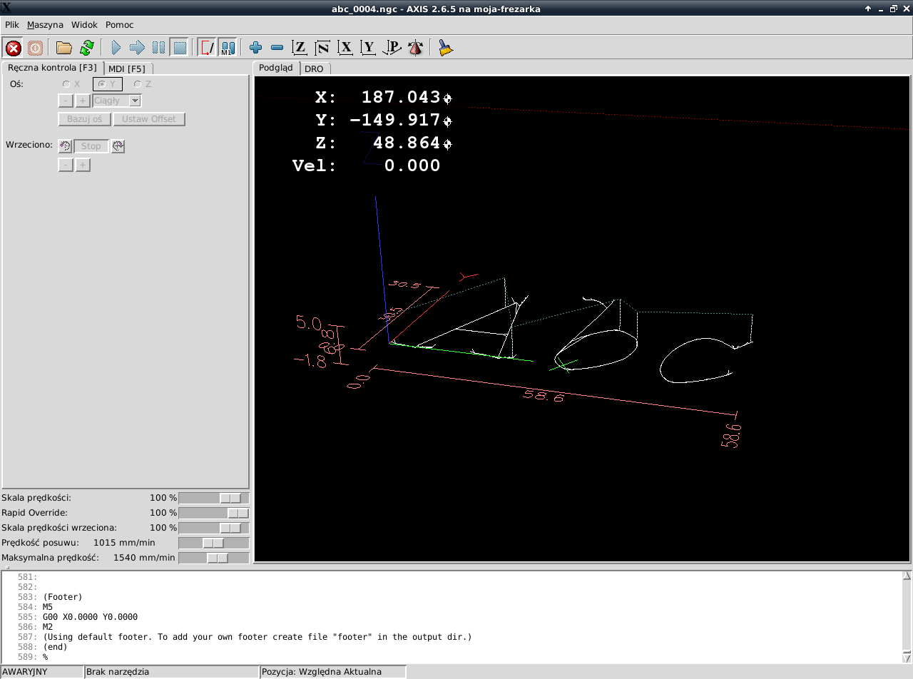 When i type: w*math.tan(60/180*3.1415) for example the g code is generated. I get message about commeny in comment in linux cnc, but i deleted this line manually. When opened gcode in linuxcnc z depth is 0, not below 0, for w*math.tan(60/180*3.1415) also the same and for 45 also.