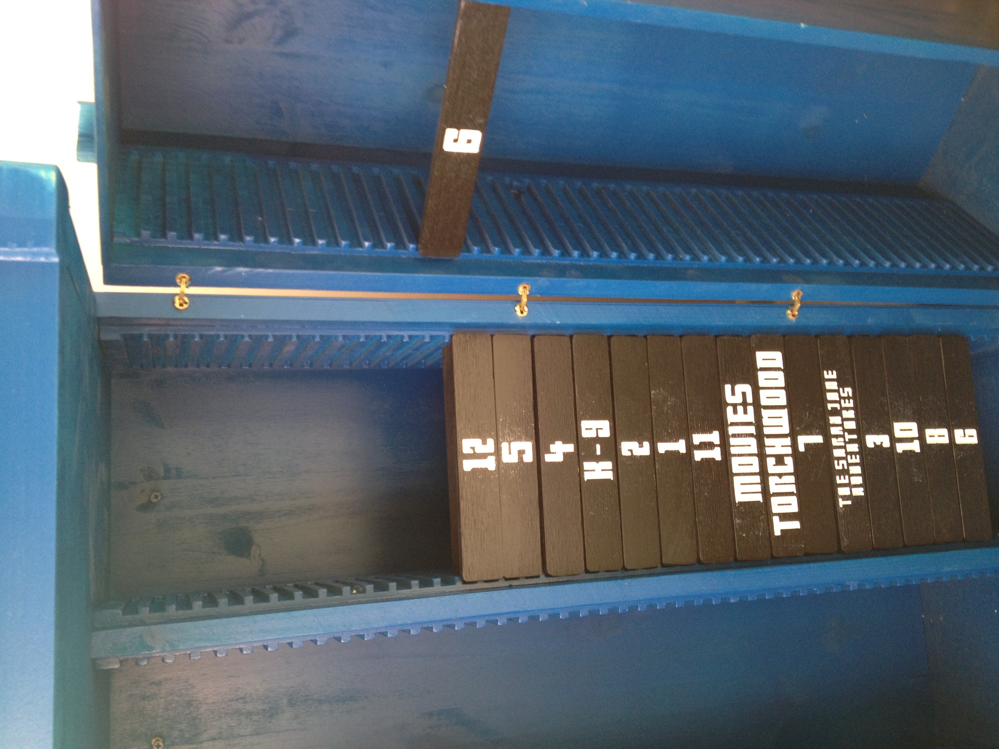 Идея была хранить в нем диски со всеми сезонами и выпусками Доктора Кто. Шильдики долны были разделить эти сезоны. Заказчик пропал - у меня остался этот шкаф. Стоит приводит в ужас всех кто не в теме и экстаз всех кто в теме. Около метра высоты. Даже фонарик напечатал для него на 3Д принтере.