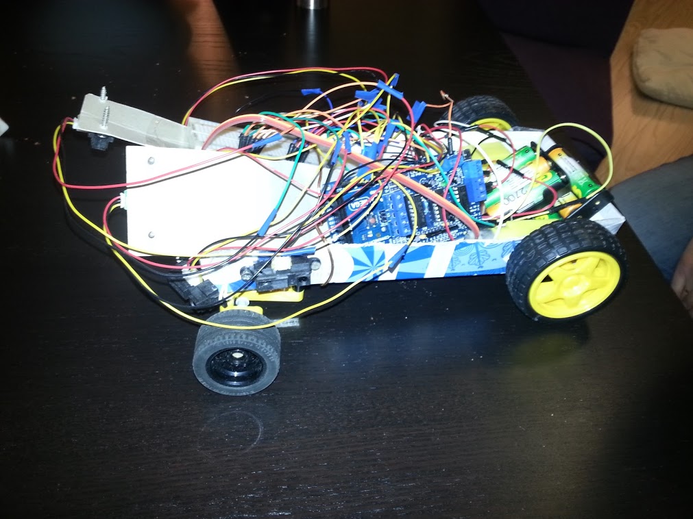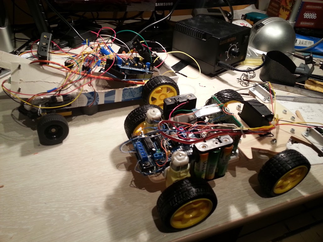 Доработал машинку. Сделал раму из фанеры, переднюю подвеску разработал и напечатал на 3Д принтере. Крепеж на нем же. Потом час с паяльником и машинка готова. Теперь все трудности связанные с контактами пропали, можно спокойно занматься программированием на стабильном образце.