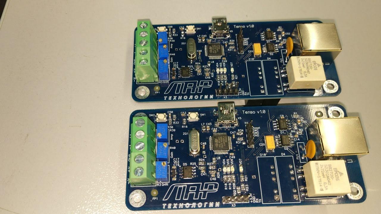 Маленькие платки для обработки тензодатчиков в реальном времени. Подключаются по ssi к Mesa 7i74. Очень удобно - подключение по 1 витой паре, по ней идет и сигнал и питание. К одной 7i74 можно подключить до 8 таких плат. Сейчас снимает показания на 2кГц. Плата работает на STM32.