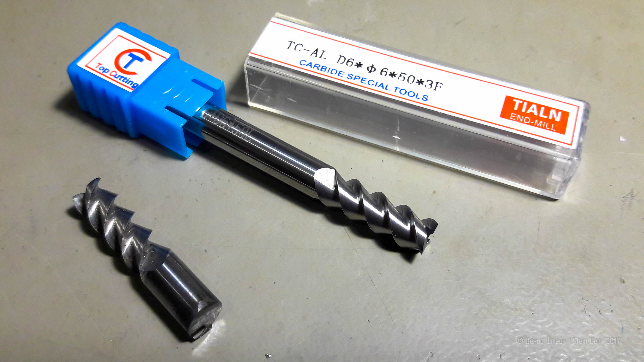Для датчика длины я выбрал сломанную карбидную фрезу 6мм. В отличии от советских фрез, она вся полированная и самое главное - торец хвостика очень ровный и выполнен под 90 градусов к телу фрезы. Без специальных приспособлений я вряд ли смог бы сделать абсолютно перпендикулярный рез вала или фрезы, а для датчика длины инструмента это крайне важно, так как это будет измерительная плоскость, пусть и небольшого диаметра . Покупал я эту фрезу на Ebay. Кончик фрезы получил скол при сбое калибровки длины инструмента об брусок дюрали. Фреза отлично вставляется в советский подшипник и плавно двигается в нем, без малейшего люфта.