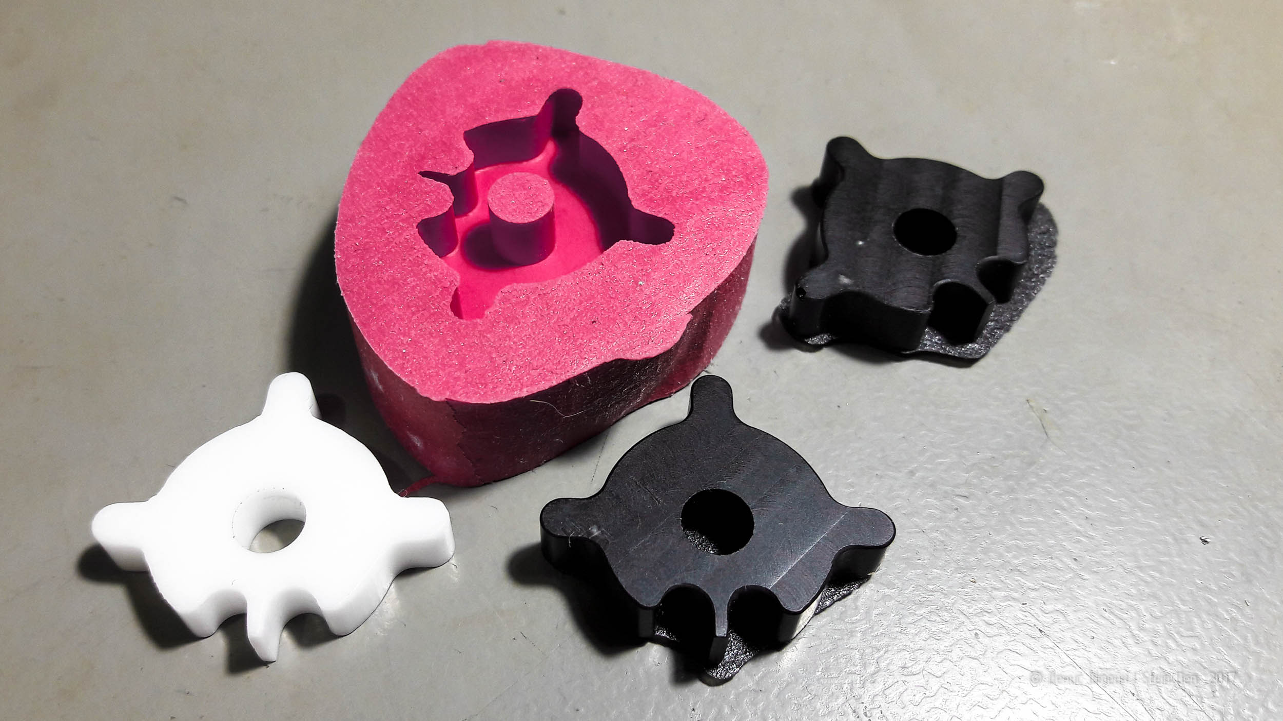 Флажок датчика я сделал из акрилового камня. Так как в этом материале нежелательно нарезать мелкую резьбу, то я сделал слепок и отлил копии. В пластиковой копии сделал сбоку два отверстия и нарезал резьбу М2 - впоследствии флажок будет приклеен к хвостику от фрезы и зафиксирован двумя винтами. На теле фрезы я сделал алмазным инструментом плоские надпилы для надежной фиксации винтами М2.