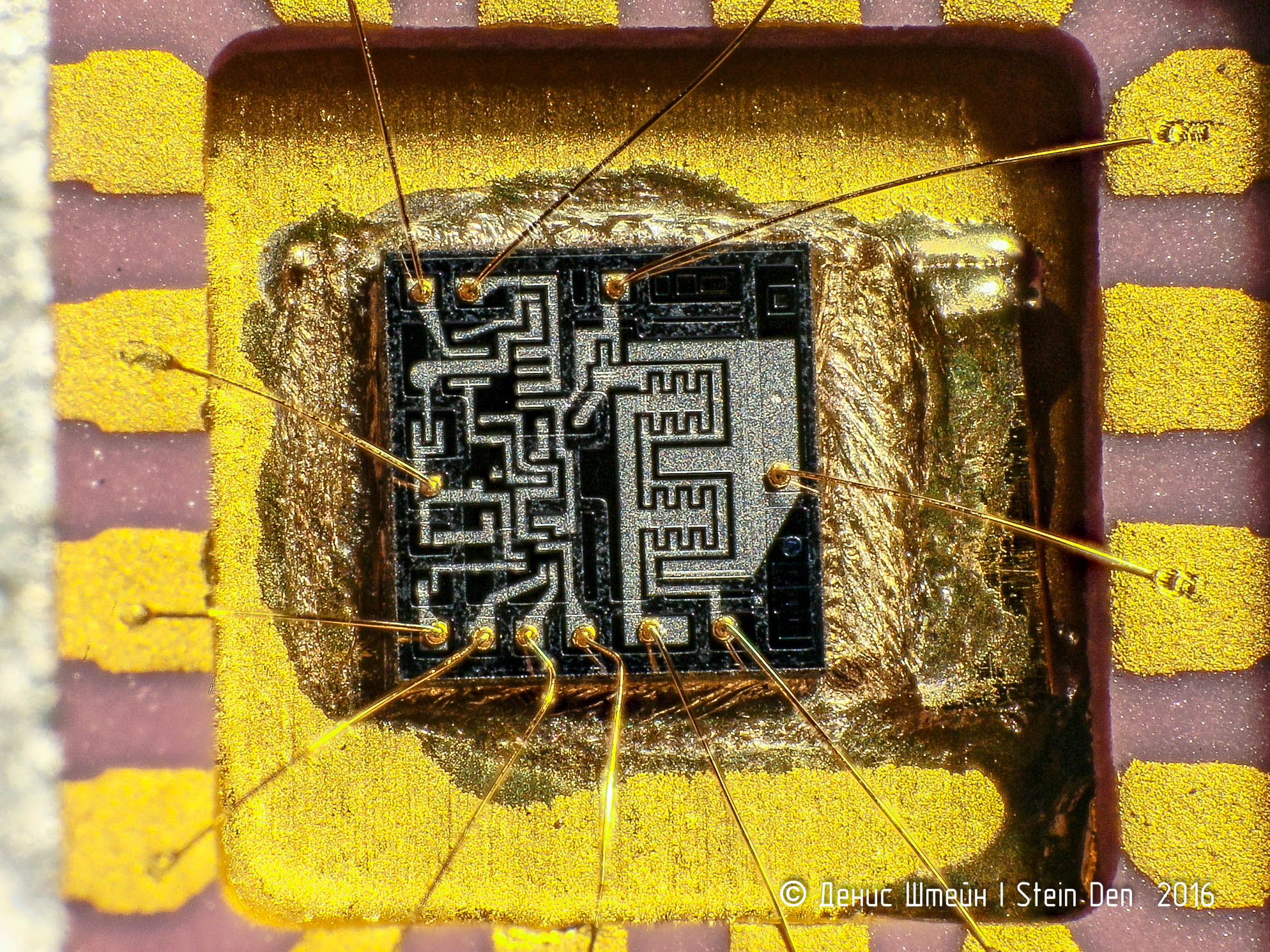 Сделал фотографию кристалла отечественного интегрального стабилизатора К142ЕН1Б, дата выпуска: апрель 1983 года. Несмотря на симпатичный внешний вид(все благодаря обилию позолоты и керамики) сейчас вряд ли кто использует подобные микросхемы. Исполнение корпуса подходит для оборонного применения, но скорее всего там уже появились более совершенные аналоги.