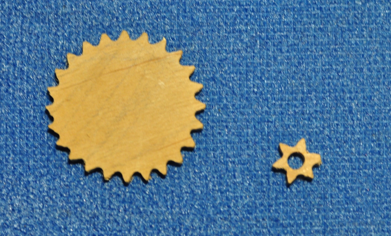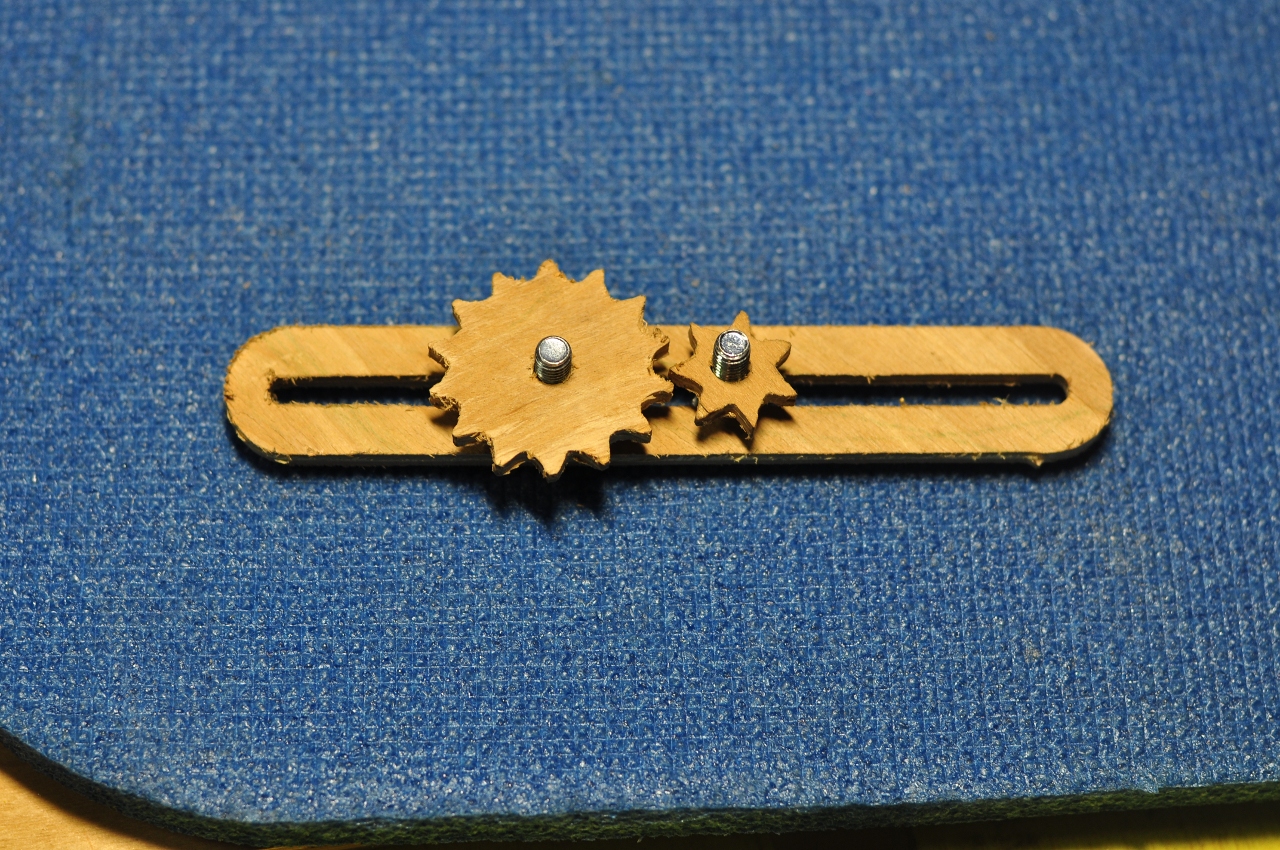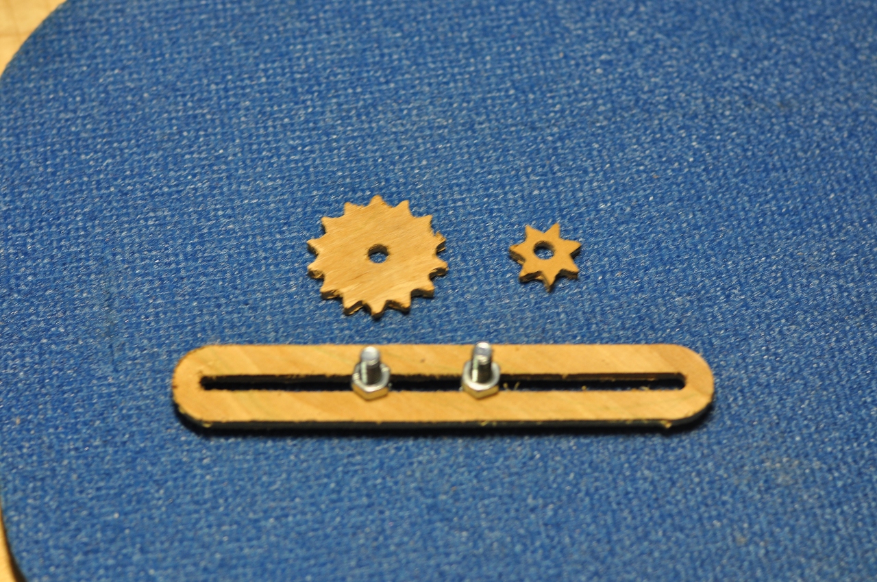 В качестве теса я решил сделать шестеренки из фанеры 24 и 6 зубьев. К сожалению отверстие в большой шестеренке вырезать не получилось...