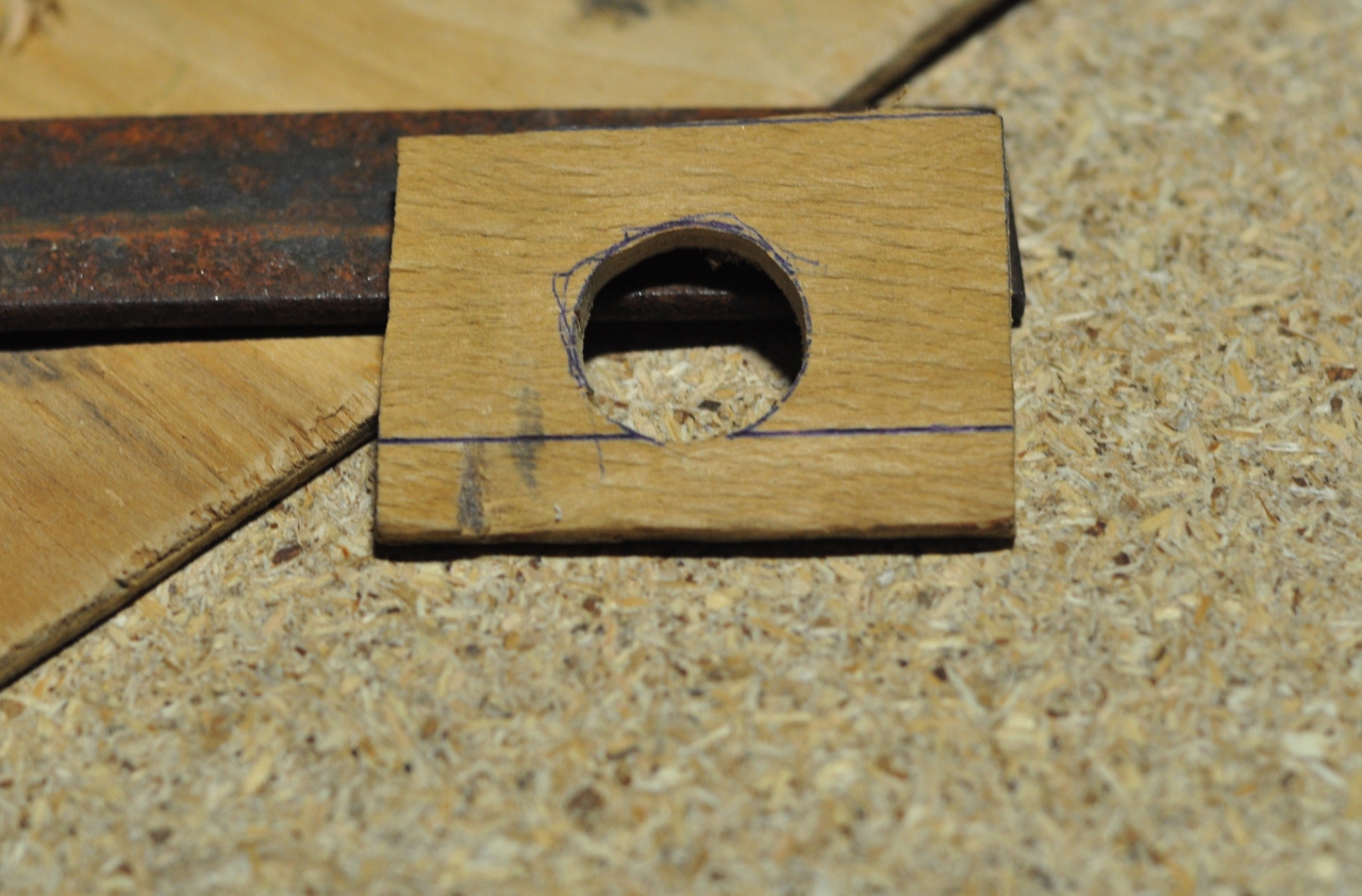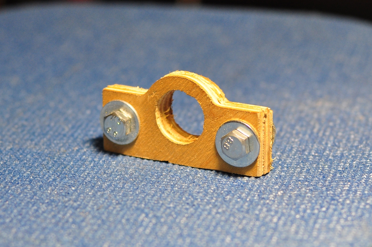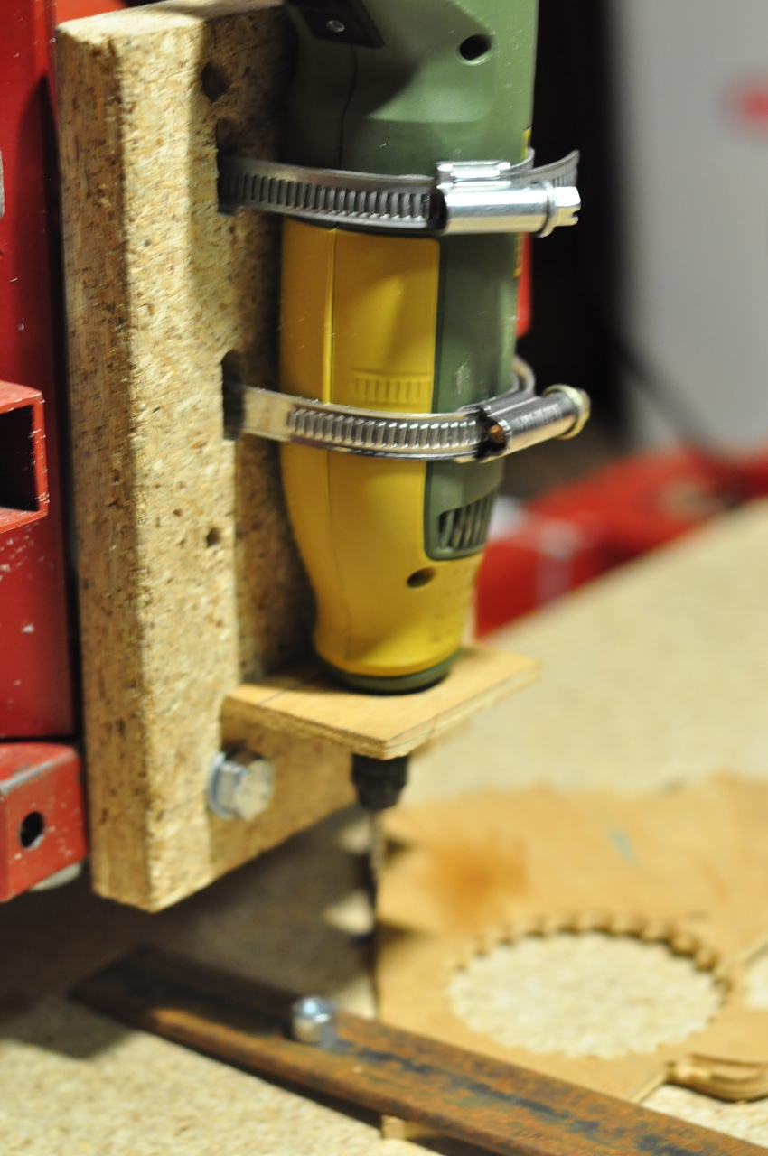 Вот что получилось: На фотографии видны дефекты, они появились из-за не надежного крепления бормашинки, выполняющей роль фрезера. Поэтому в качестве второго теста я решил сделать дополнительный крепеж для фрезера. Сначала я вручную выпилил маленькую подпорку: Подпорку я никак не крепил, она встала враспор и сама зафиксировалась. Хотя этого не хватило и на следующей детали траектория ушла вбок.