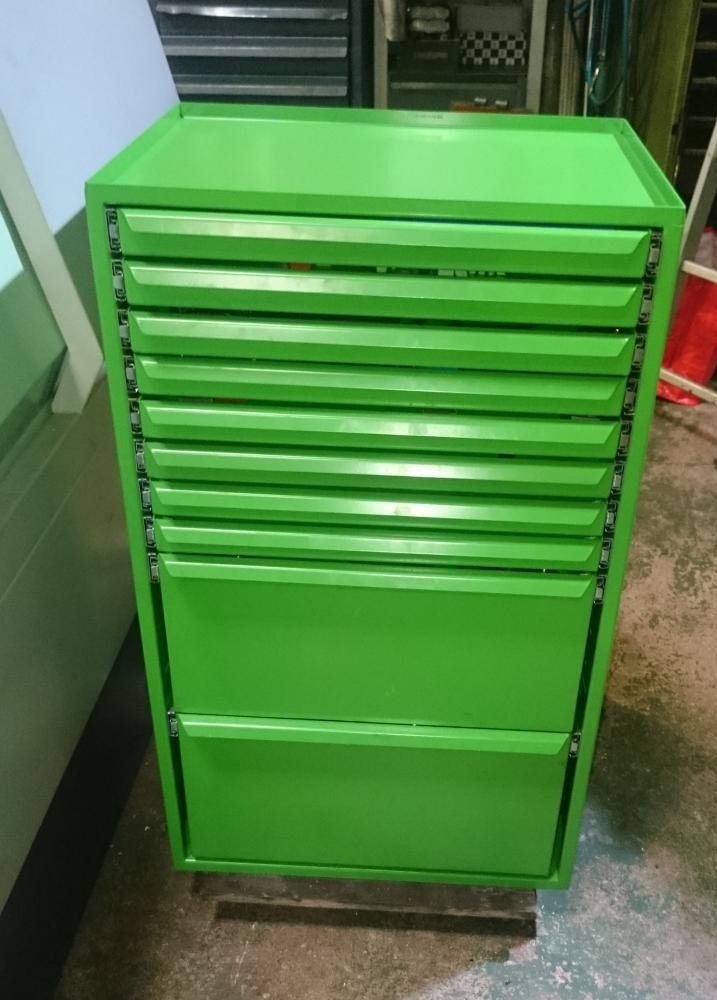порезанный и погнутый металл - сам шкаф: ящики: вкладыши под фрезерную оснастку ИСО-40 (BT, SK)... сборка ящика... верхняя крышка сделана лотком, чтобы ничего не падало.. отбортовка высотой 15мм... готовый, покрашенный шкафчик: ну и в начале наполнения... Собственно это был первый вариант. он был полностью переработан, в плане технологичности сборки (уменьшение возможностей накосячить), уменьшения металлоемкости (как следствие цены), доработаны и убраны всякие мелкие косячки - на этом ящике предняя панель самого ящика не закрывает направляющие - просто не аккуратно выглядит по сравнению с токарным.. и не учел что направляющие реально отличаются от заявленных размеров в большую сторону - как следствие передние торцы торчат на 1-1.5 мм.. новый ящик сделал уже с ушами, прикрывающими направляйки и увеличил в глубину так чтобы эти самые направляйки не торчали...
