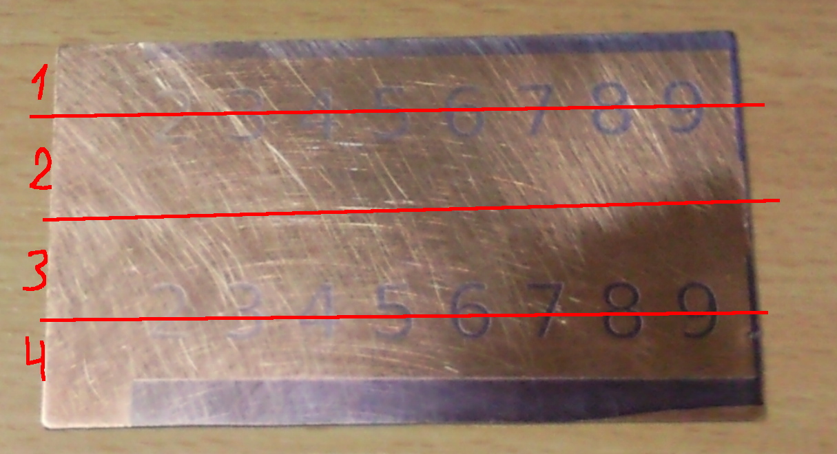Лазерный принтер, даже не позволяющий регулировать плотность тонера даёт хороший результат. Не смотря на то, что на глаз тёмные области выглядят довольно таки сомнительно для УФ они получаются практически непрозрачные - можно смело засвечивать минут 10 и всё, что надо удовлетворительно смывается. Ниже фотка платы после лазерного фотошаблона, на плате есть 4 области. 1 и 3 области - непрозрачные области сделаны чёрнын тонером, 2 и 4 области - непрозрачные области сделаны тремя цветными тонерами в макс. насыщенности. 1 и 2 области - шаблон использовался сразу после печати, 3 и 4 области - шаблон был обработан усилителем плотности тонера. Фотка конечно так себе, но в реале все 4 области полностью одинаковы при проявке и в результате. Время засветки - цифра * 30 сек. В дальнейшем решил светить по 5 минут, хотя и после полутора минут уже хорошо держится.