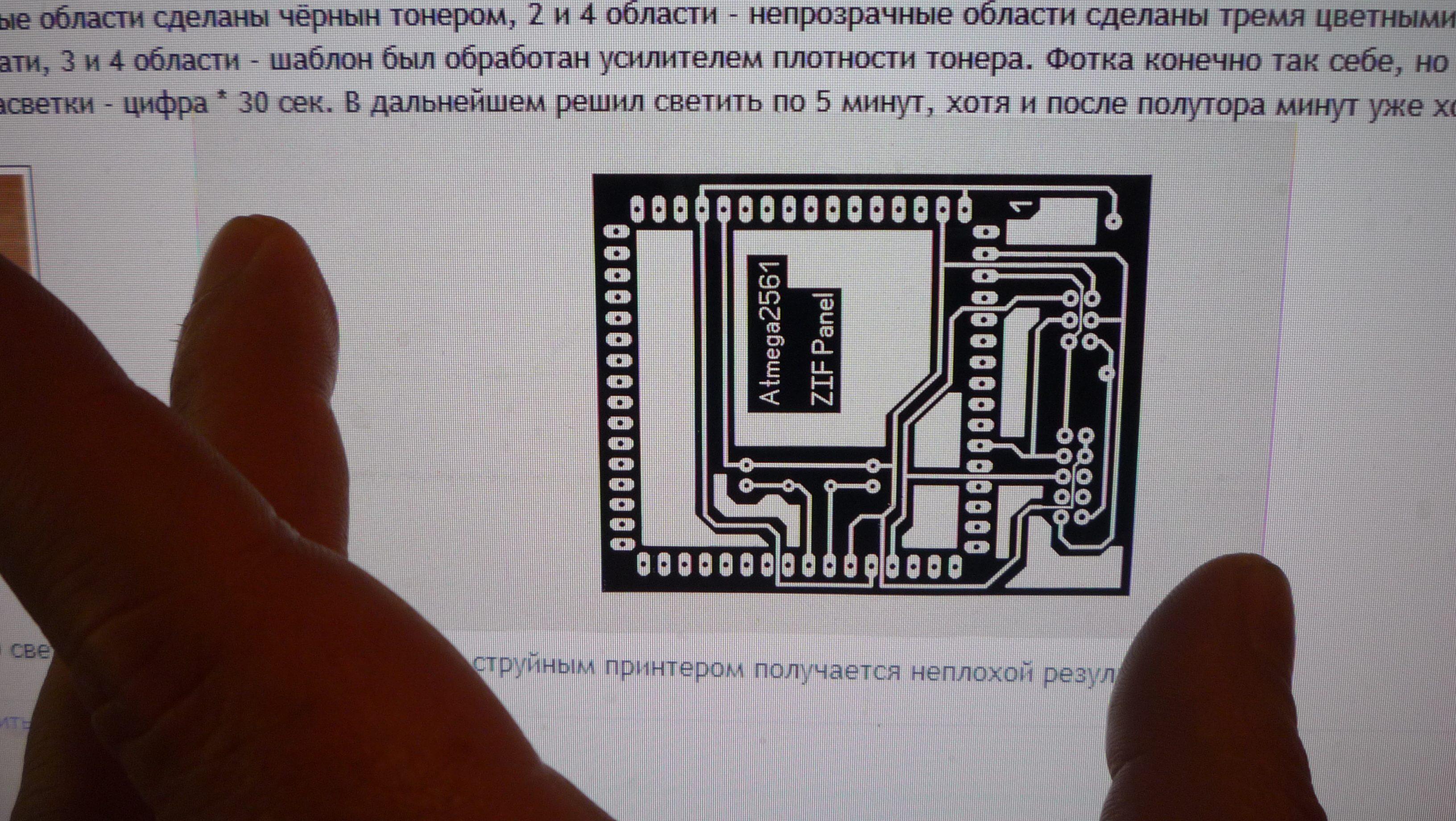 Струйный принтер даже с пигментными чернилами - это самых худший выбор. На глаз тёмные области вроде хорошо закрашены, но для УФ оказываются слишком прозрачны. При засветке более минуты уже возникают трудости с проявкой - плохо смывается то, что должно быть незасвечено. При засветке более 4 минут незасвеченные области уже невозможно смыть не повредив мелкие дорожки. Фотку не сохранил т.к. изначально не собирался публиковать результаты.