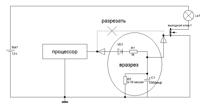 И еще чтобы снизить линейный режим включения-выключения транзистора (чтобы негрелся если мощная нагрузка), нужно перед ним поставить диод или стабилитрон последовательно, с падением напряжения чуть меньше минимального напряжения открытия транзистора и резистор которы паралельно емкости, поставить между минусом и затвором. Но должно и так работать . схема рабочая у меня на мотоцикле стоит, на реле выключающую магнитолу. Время там около12-15 минут.