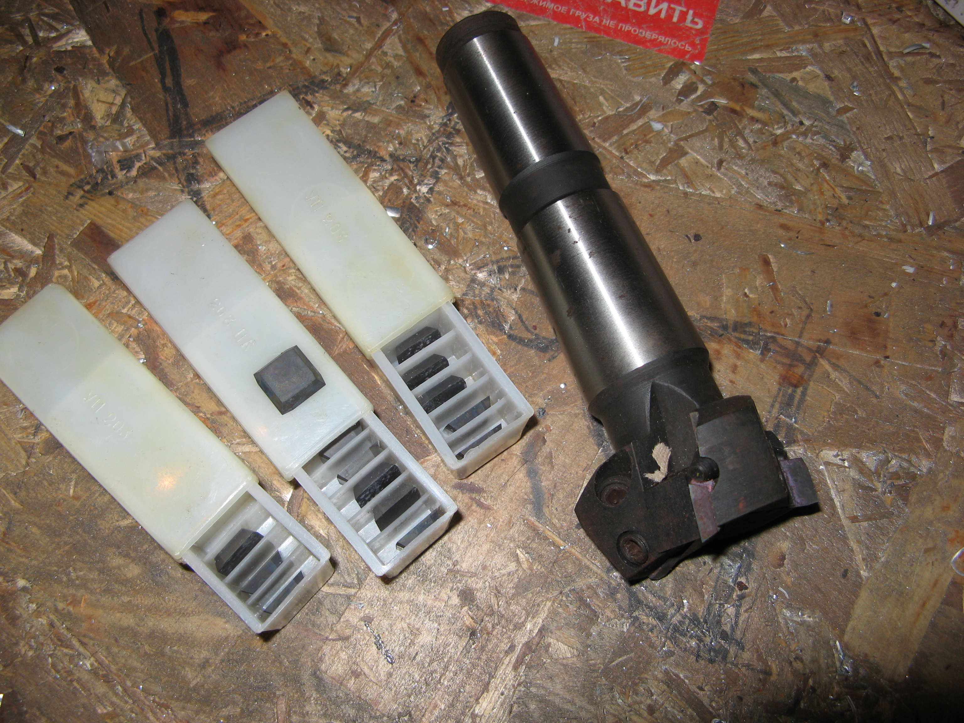 довольно скромный, но не менее полезный подарок сделала судьба - купил товарищ фрезу по мягким сплавам в Херсоне - спасибо, Денис. вот сегодня забрал с почты. фреза+27 пластин обошлись около 12 баксов. теперь будет веселее мне стружку делать на черновых операциях (думаю так). пластинки хитрый квадрат со скосом (точнее с 4 скосами)