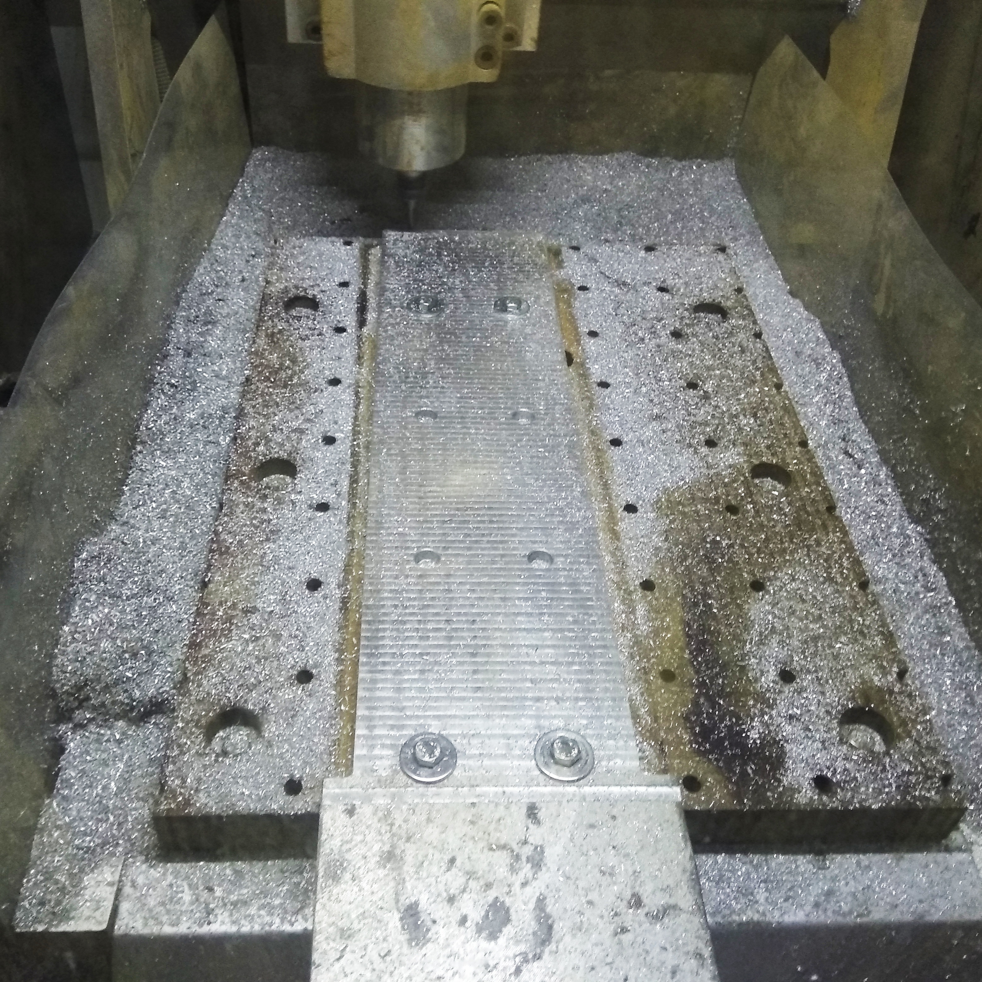 Фрезеровал всё сам. Станок не очень жесткий для дюраля, да и дела с ним не имел до этого, поэтому пришлось повозиться. Плюс габарит основной плиты больше рабочего поля.