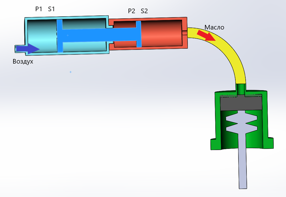 Не понимаю в чем проблема. Если пневматика вдавливает шток в ГЦ, жидкость несжимаемая субстанция, по объему вдавленного штока и перетекает по шлангу в исполнительный ГЦ. Давление возникаемое в ГЦ обратно пропорционально диаметру штока в ГЦ в соответствии с правилами расчета ПГУ. Тут вопрос только в том - какая плоскость создает давление в ГЦ "торец" (приношу извинения за упрощение) или площадь всего цилиндра, входящего в объем ГЦ.