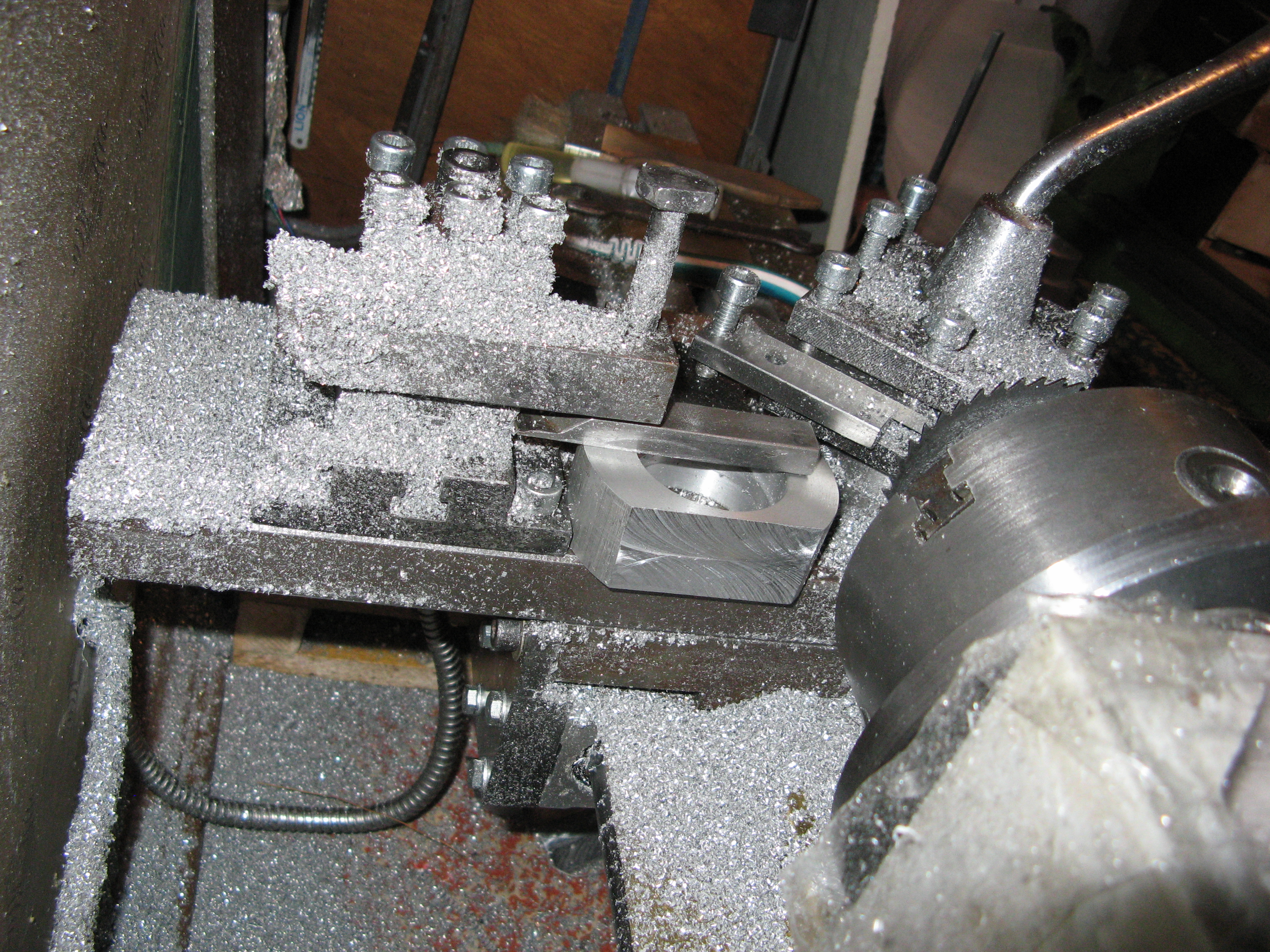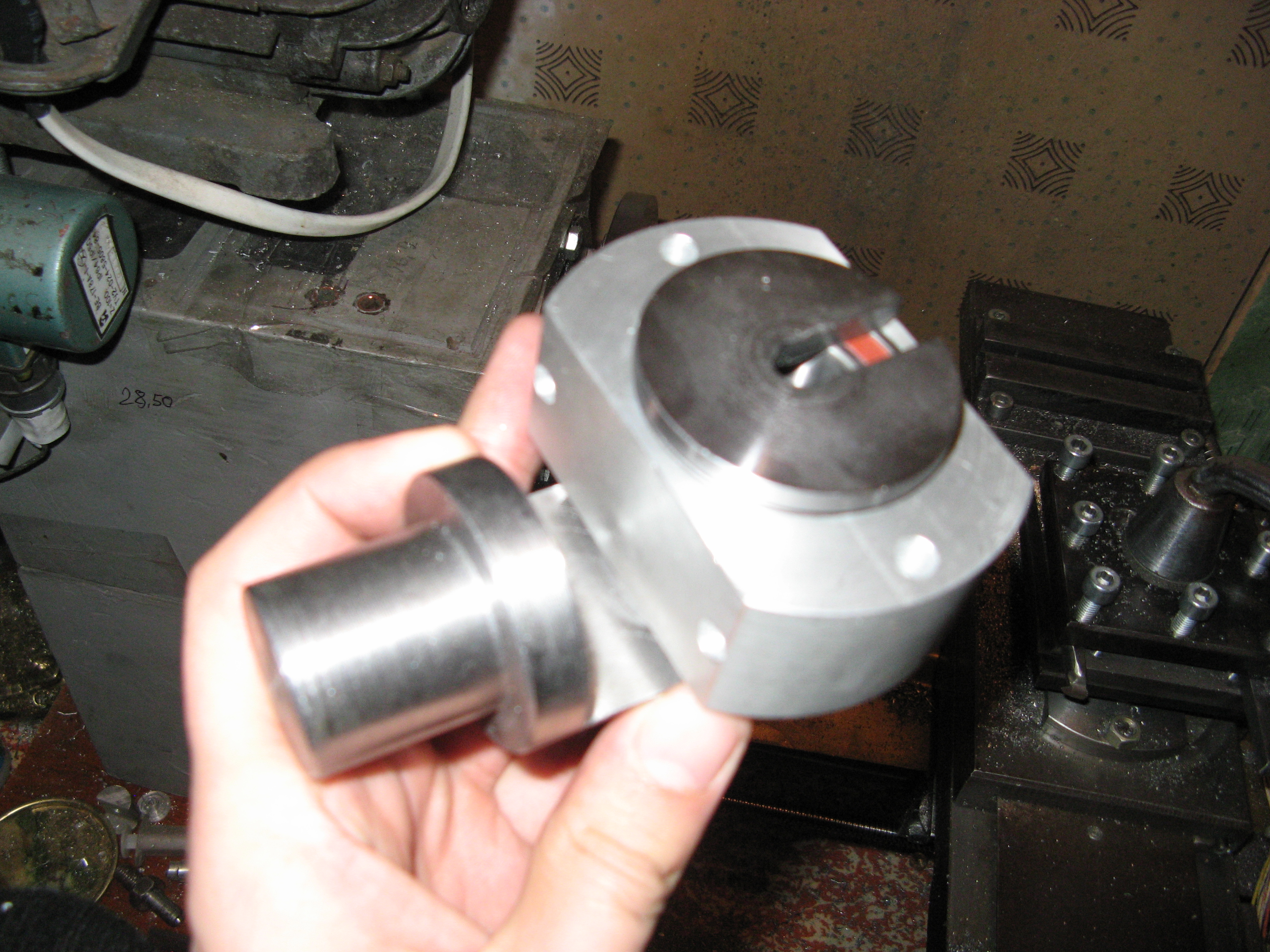 приспособа для проточки предельно проста, думаю на фото все прекрасно видно, единственное что не сделал фотографий самого корпуса а сейчас расспресовывать подшипники не хочется. вырез в крышке помогает быстро снимать деталь не откручивая полностью всю гайку
