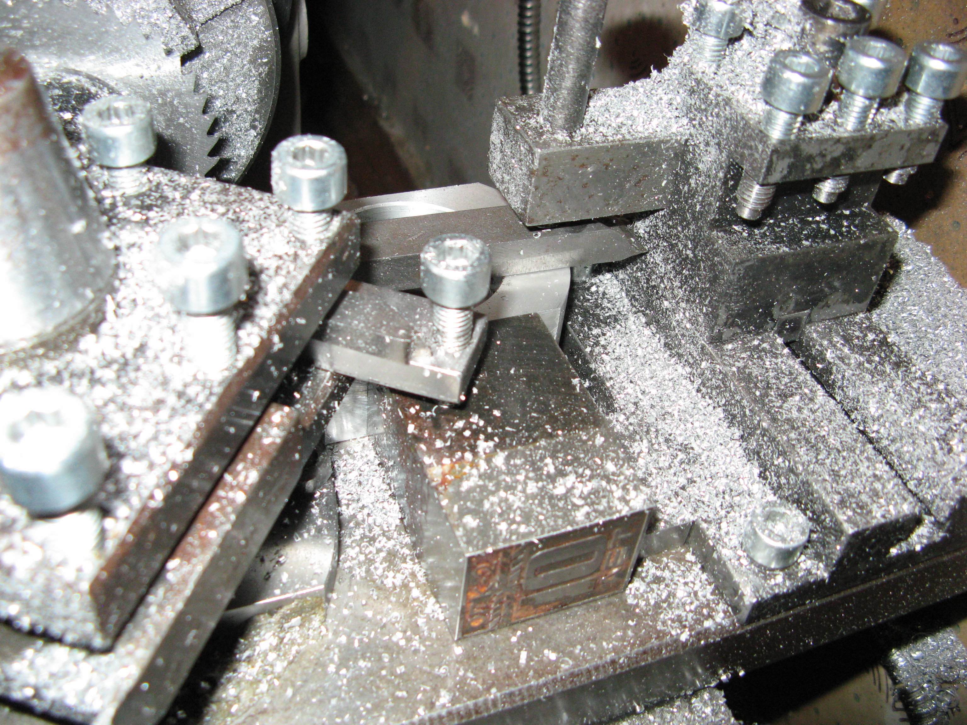 забыл сказать, что из оборудования только токарный станок чпу, ну и сверлилка у знакомых, которой я тоже пару часиков пользовался. в шпиндель зажал фрезу 80х1, заготовку ложу на супорт до упора, режу с одной стороны, переворачиваю, центрирую отпил вставляя пластинку в щель и подбирая вылет при помощи стареньких КМД.
