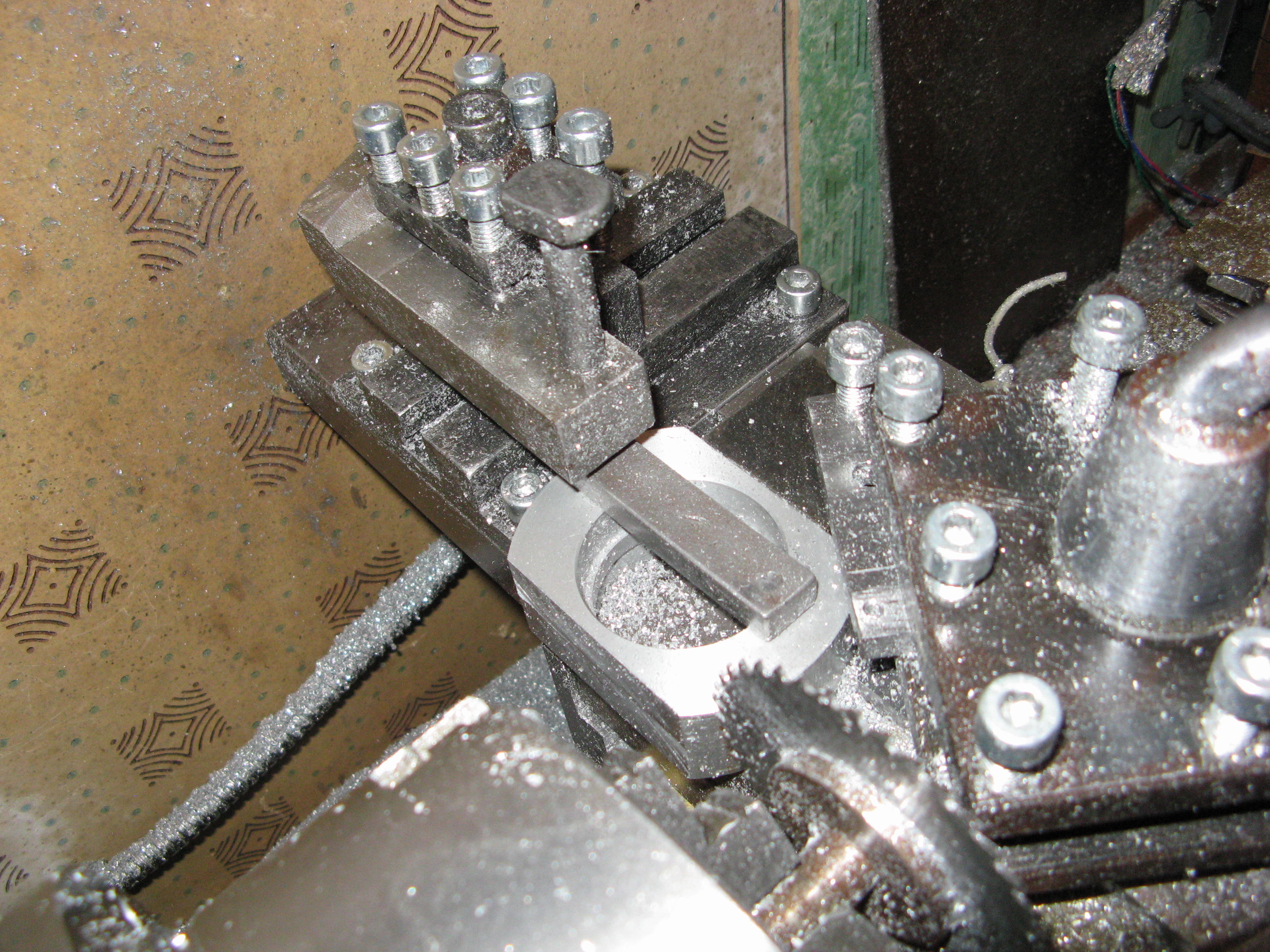 дальше переворачиваю деталь, упираю уже плоской стороной в брусочек, который перед этим специально выставил паралельно пиле... после этого остается только проточить вчисто эти лыски, потому как ступеньки иногда образовывались - пилу уводило немного, хотя может это все решилось бы установкой пилы поболее чтобы резать з араз и шириной пару мм хотя бы. не знаю, может в следующий раз попробую если пилу найду подходящую.