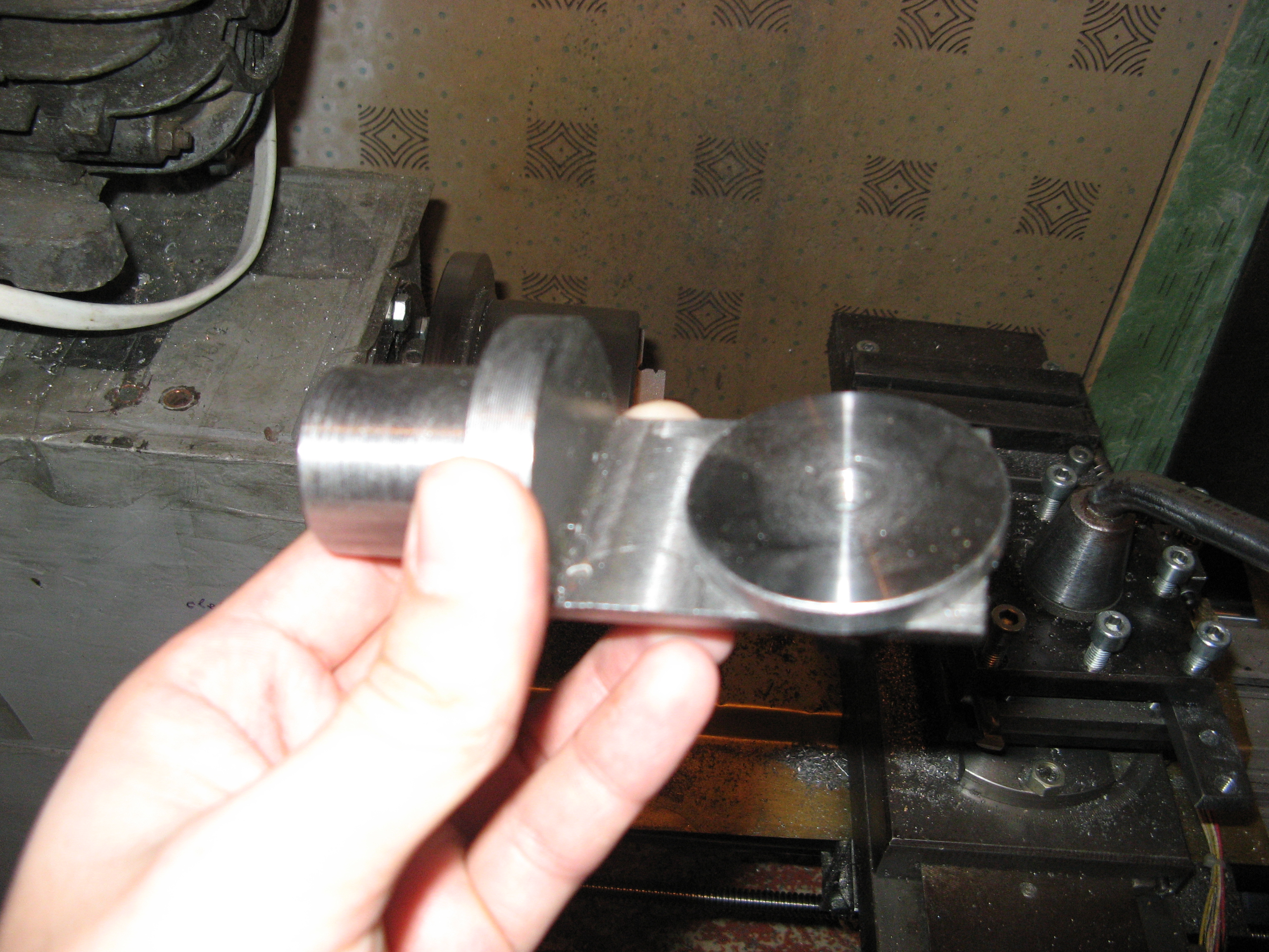 На одной фирмочке прикупил Круг 25 БРОЦС-555 а также Круг 35 ст.Д16 для гаек и шкивов. Постараюсь более-менее подробно описать процесс постройки, фоток и видио снимал много, правда проект делался практически пол года в связи с временными и материальными трудностями. когда все уже лежало на ковре начал думать как пилить дюраль на корпус. В самодельный токарный такой размер не всунуть, пришлось попыхтеть простой пилкой по металлу. купил правда полотно-биметалл с крупным зубом, но об этом не жалею. сделал простую приспособу чтобы резать перпендикулярно - свернул лист жести кольцом, схватил скотчем. подвинул на нужное место, обвел маркером - линия получается ровной. после этого попилил, провернул, снова попилил. следует отметить, что делал всего 2-2,5 мм запаса на длину это при ширине полотна всего 0,9мм и все косяки ушли после торцовки, так что вариант резки очень даже экономичный, но требует определенных трудозатрат после этого впринципе все просто - подторцевал, просверлил, расточил вчерно, расточил вчисто с 1 установки (посадка подшипников как никак). Далее надо было срезать лыски. тут мне пришла в голову идея по механизации, потому как пилкой намахаться я уже успел прилично.