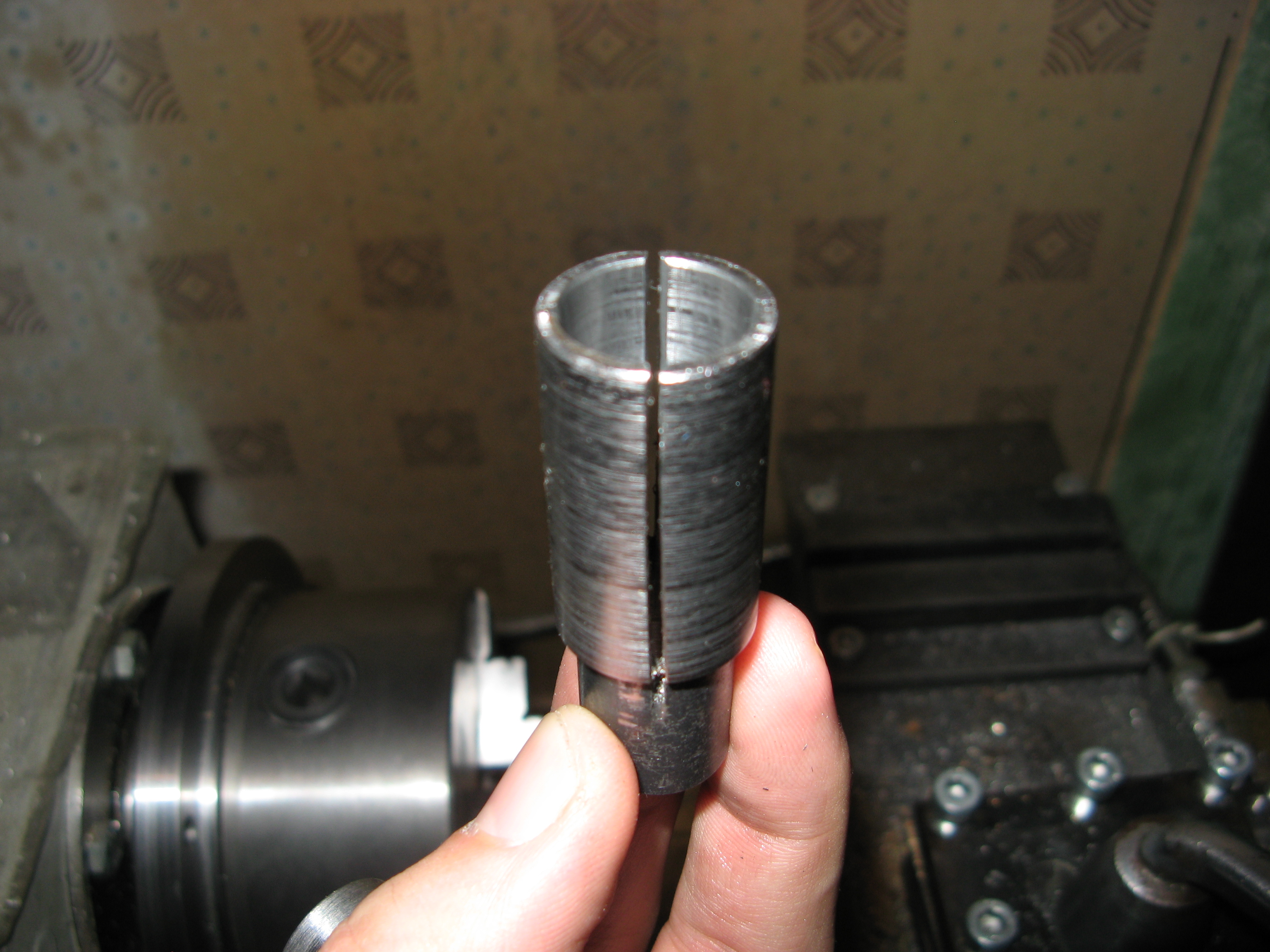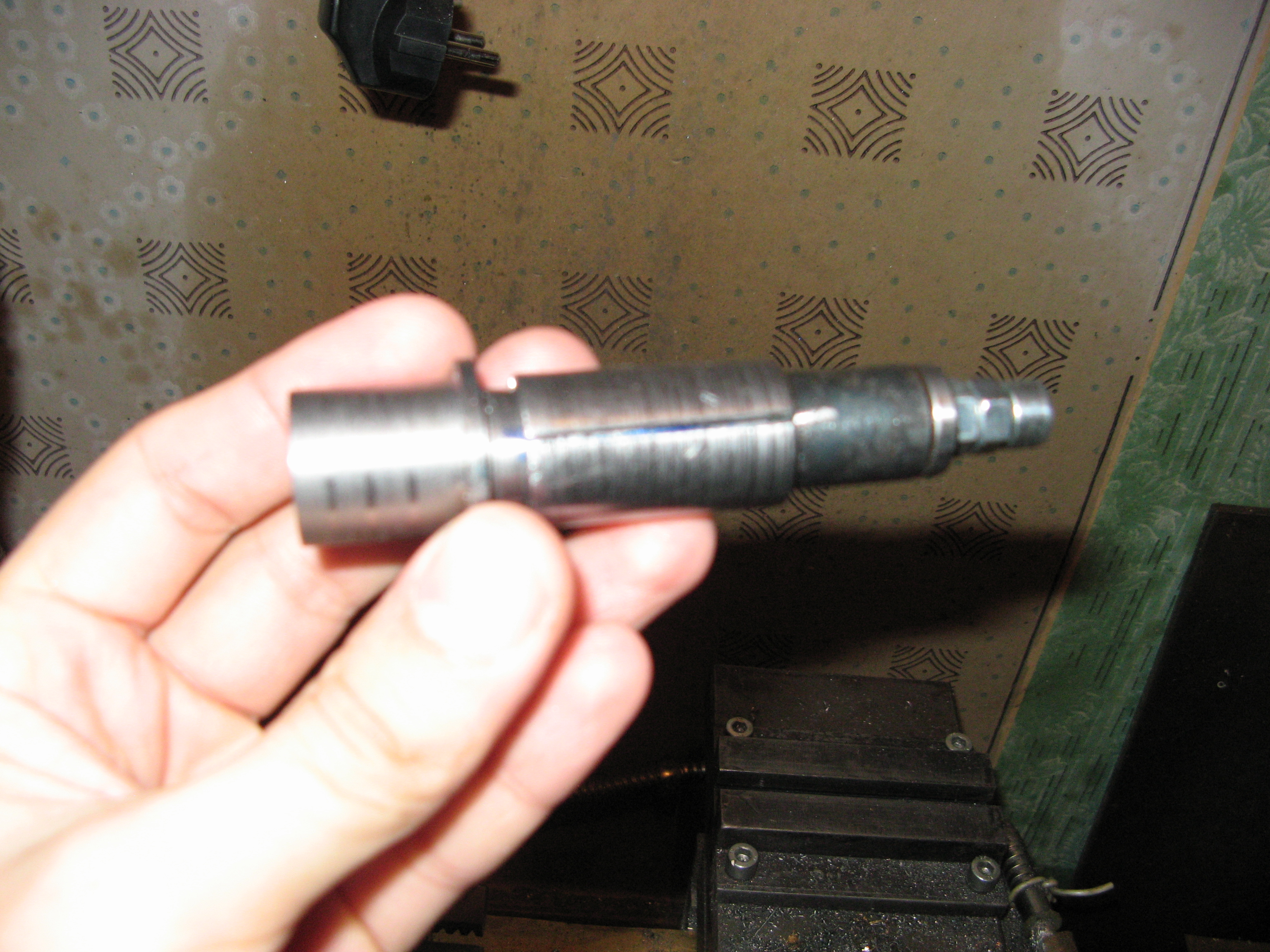 Хотелось также описать конструкцию разжимной цанги, которая тоже была сделана для обработки стальной оси. она позволяла обработать сразу торец и проточить по диаметру посадочные пояски подшипников. должен заметить, что при правильном изготовлении получается прличная точность - при повторной установке биение до 2х соток.