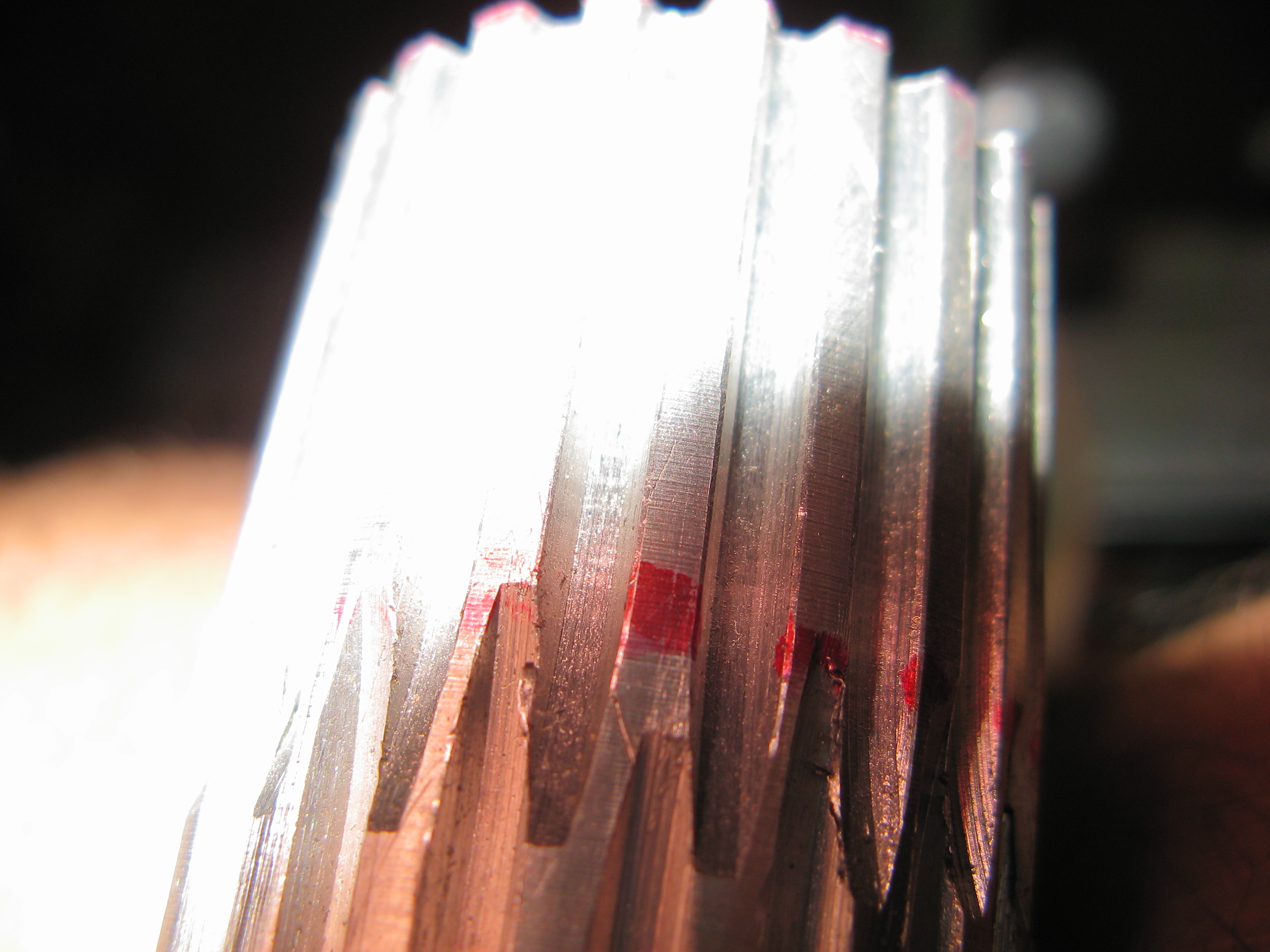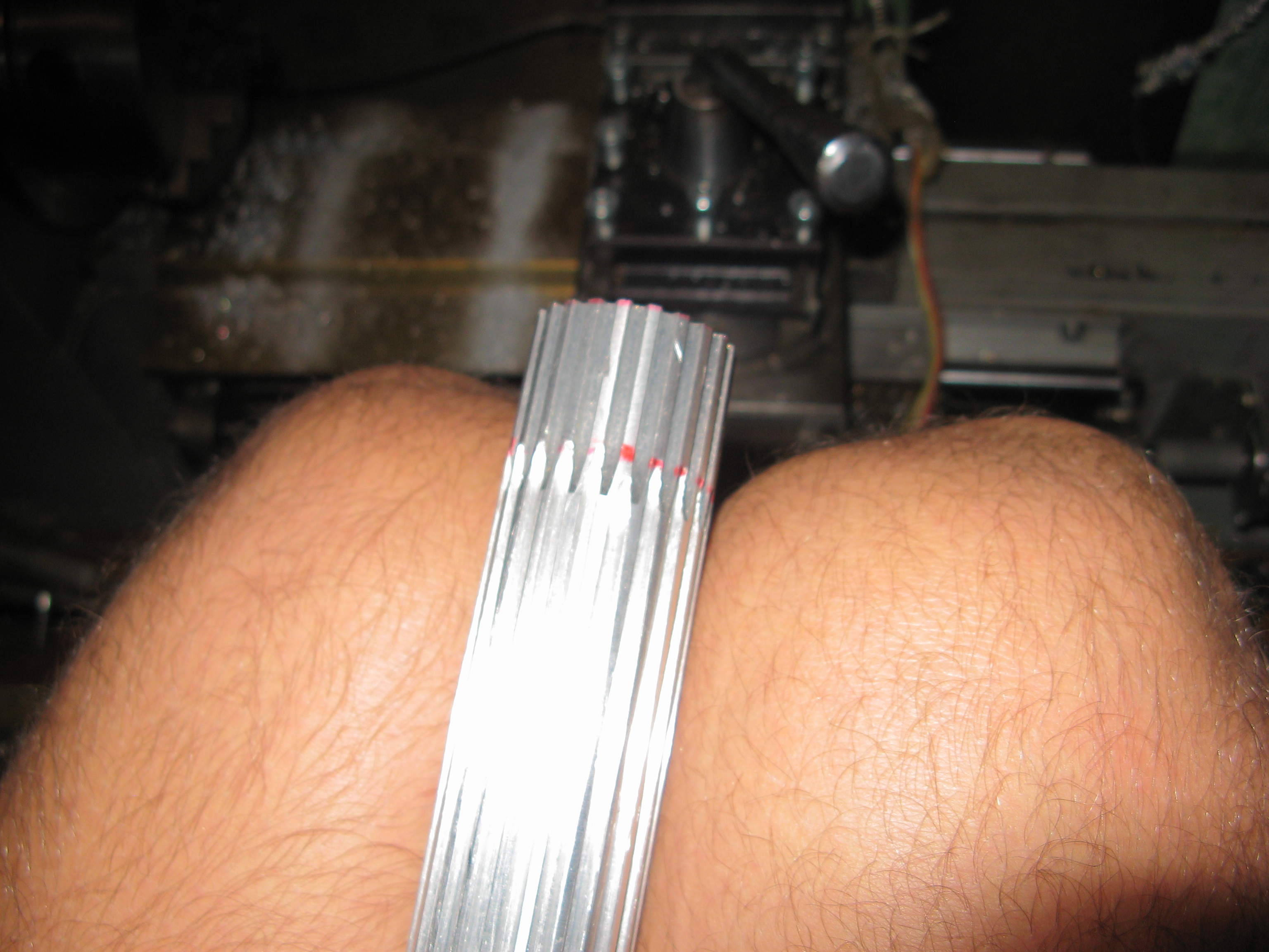 теперь немного поговорим о шкивах. в связи с распространенностью китайских и не очень ремней к рубанкам с профилем зуба XL было решено на его и ориентирвоаться. помогли мне и нафрезеровали "палочек" из которых я потом порезал и поточил шкивы. качество получилось нормальное, геометрию профиля зуба делали на оптикошлифовальном, далее контроль размеров согласно рекомендаций производителя ремней (не помню где нашел, сейчас залить не могу так как на другом компе)