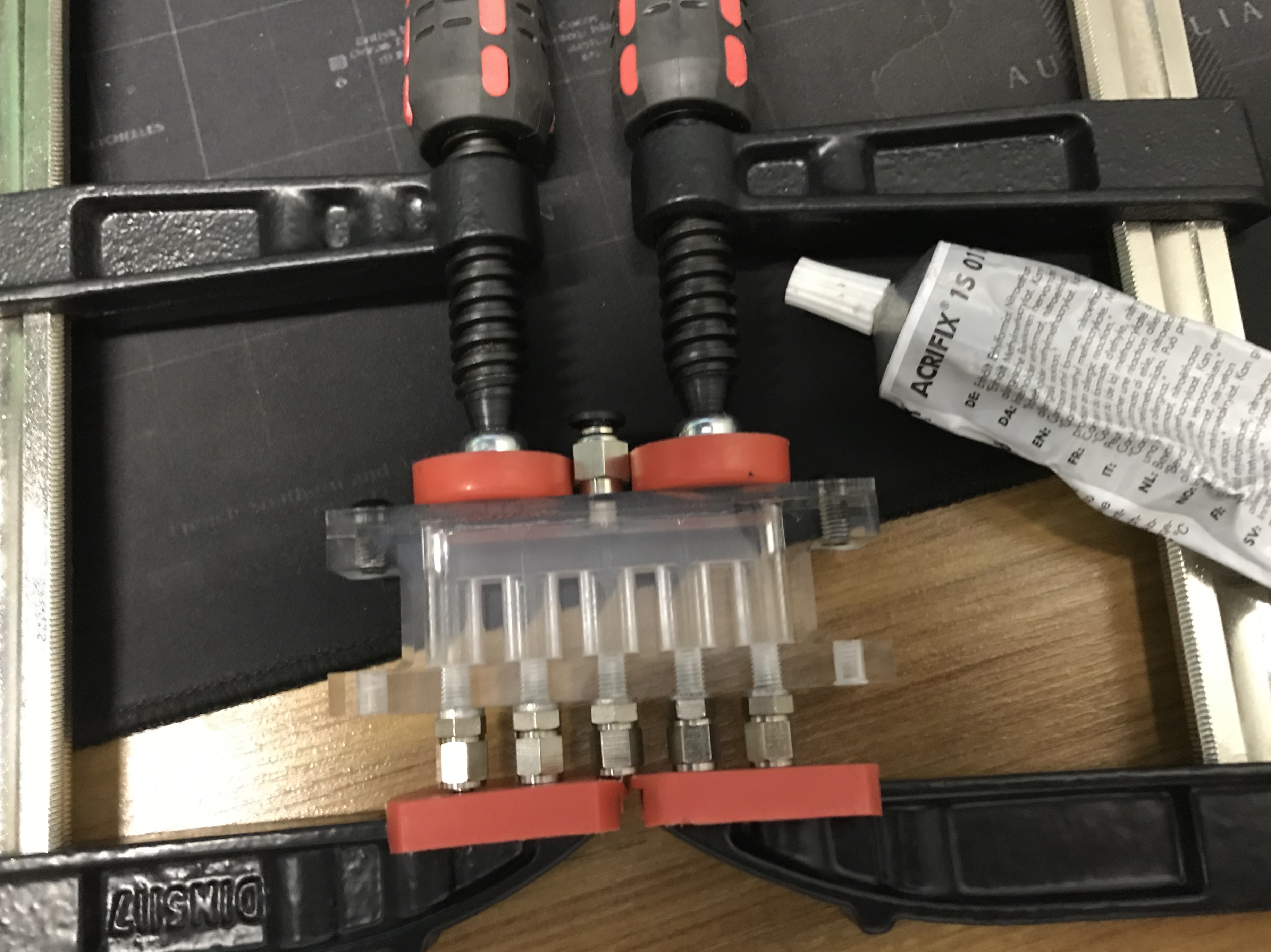 Для экономии можно просто шприцы медицинские пристегнуть стяжками к фанерке и от них трубочки развести. Запустить станок, проверить как система работает и потом уже по-приличнее что-нибудь запилить.