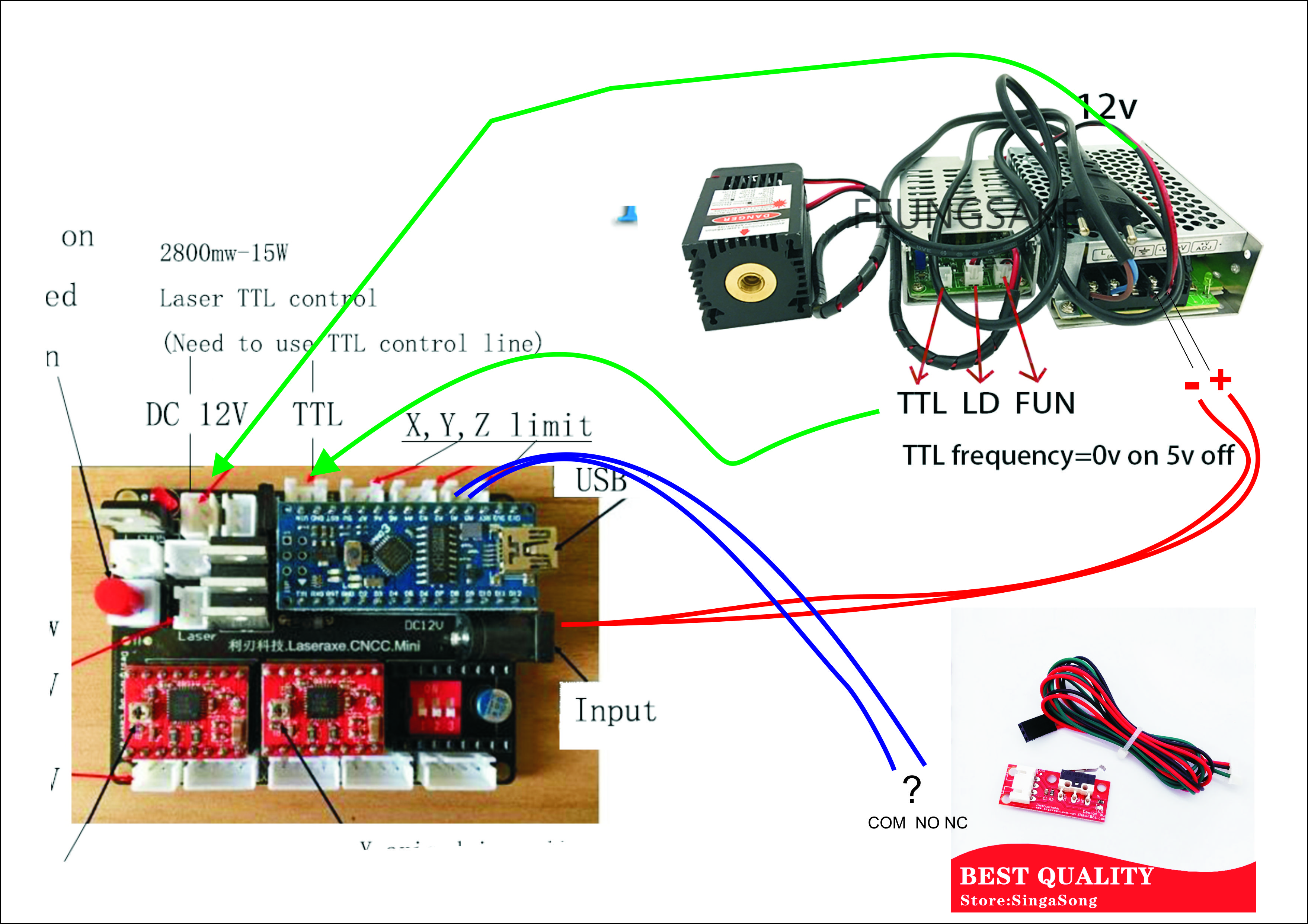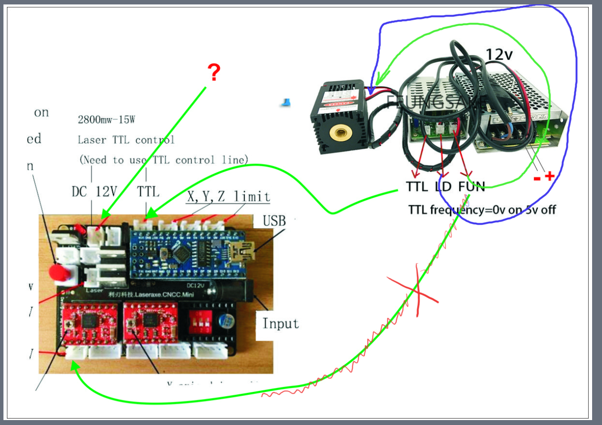 Имеется вот такая плата: И вот такой лазер на 15Вт: Как правильно подключить этот лазер к плате? От драйвера ТТЛ идет pin2 (два провода). На плате управления - китаец показывает что нужно в одно гнездо подключить 12В а во второе ТТЛ (я так понял что вот этот pin2 от драйвера). Или я ошибаюсь.