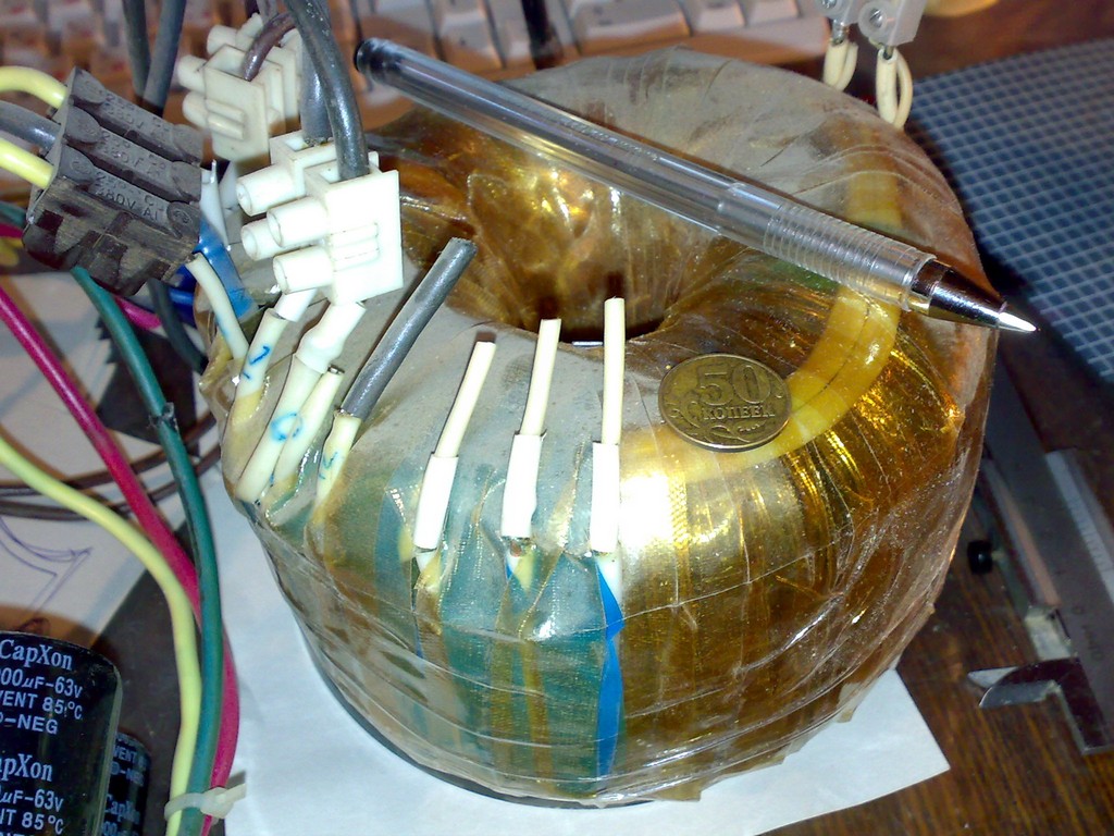 трансформатор ториодальный (по теме в верху на фотке),провода- первичная Ф0.5мм, вторичная Ф1.6мм.