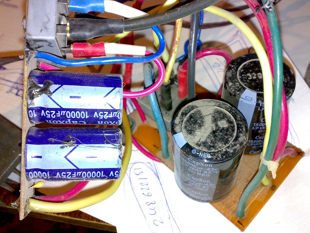 исключил 0.1мф кондерчик. добавил предохранитель . добавил диод мощный , какой дома нашелся тот и вставил, это на всяк случай чтоб обратка не проскочила . общий обьем конденсаторов 50000мф. я так понимаю и движкам будет полекгче стартовать и будет куда скинуть лишнее.