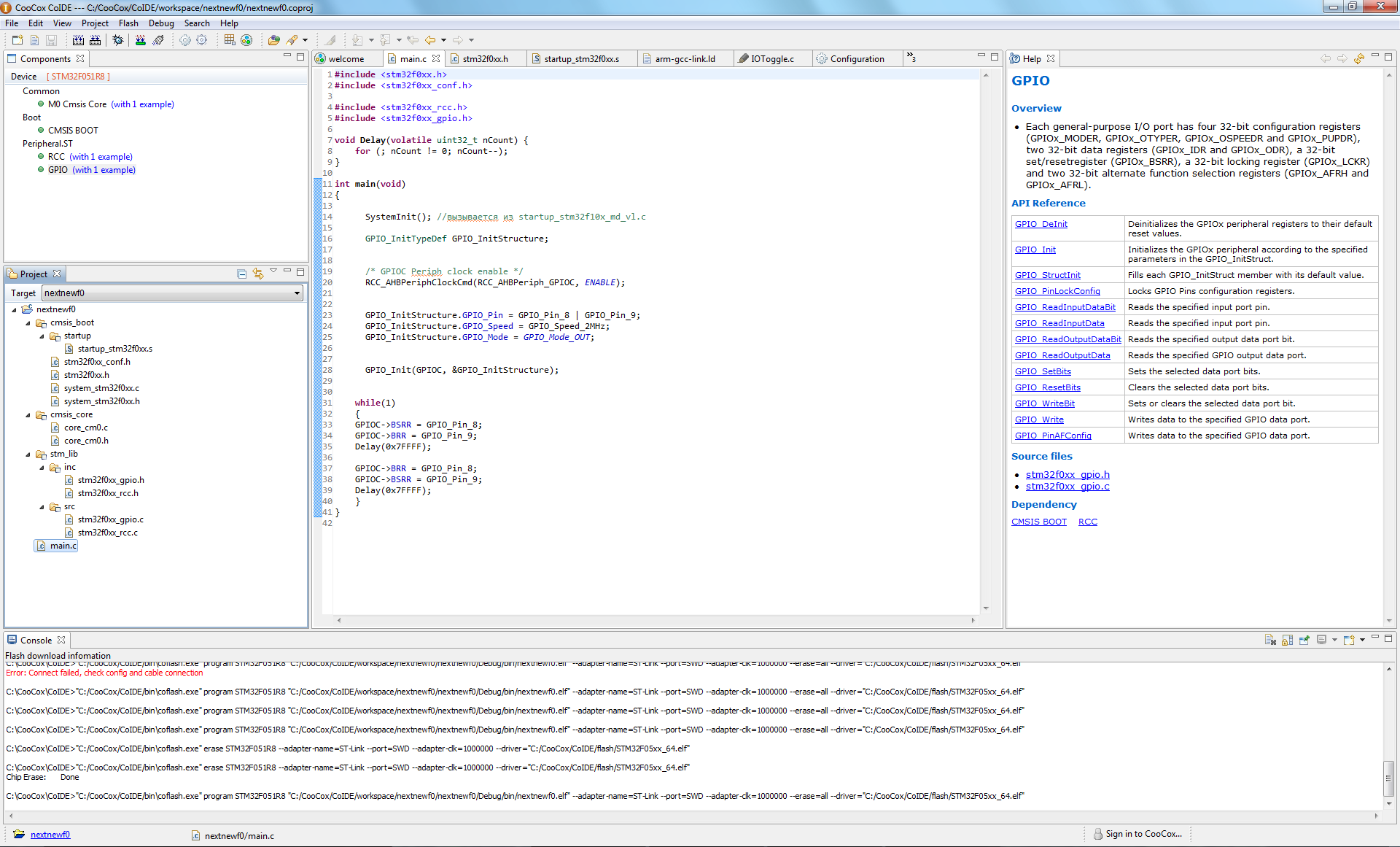 Пока что мне удалось написать пустую программу на CoIDE и загрузить ее в отладочную плату. Исправить существующие примеры под свой микроконтроллер не удалось, т.к. названия функций, переменных и констант отличаются, и где я что делаю не так я не смог понять. Ситуацию усугубляет вот такая справка, с которой очень тяжело работать: