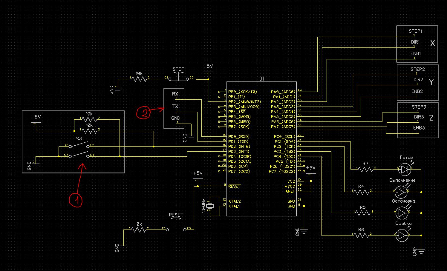 Мой прототип выглядит пока так: Для работы с контроллером, можно использовать любую терминальную программу, процесс работы такой, посылаем команду например что по оси Х нужно в таком-то направлении выполнить 500 импульсов, а по оси Z 50 импульсов, контроллер отвечает что параметры приняты, после этого посылаем команду выполнить, и контроллер начинает выполнять, и по завершении отправляет команду что выполнено.