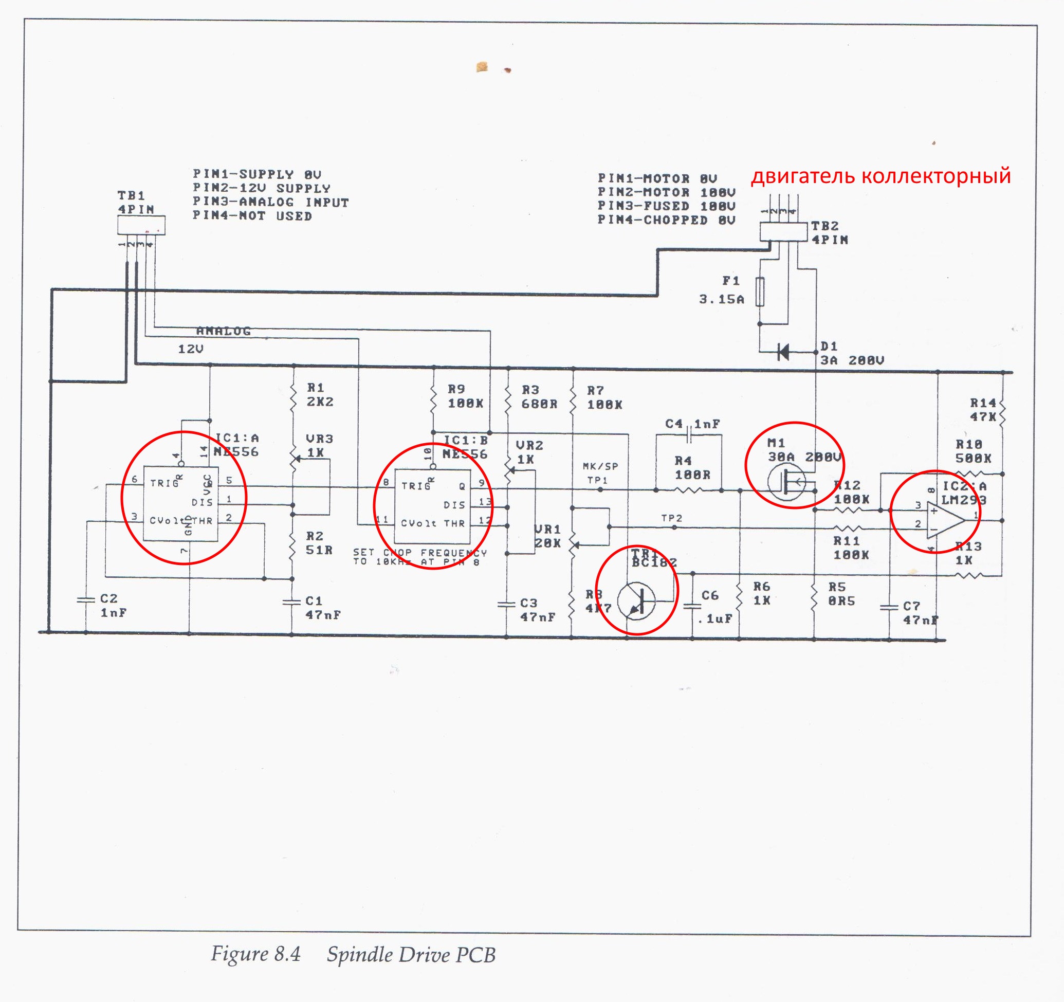 При заклинивании шпинделя сгорают элементы обозначенные на схеме.