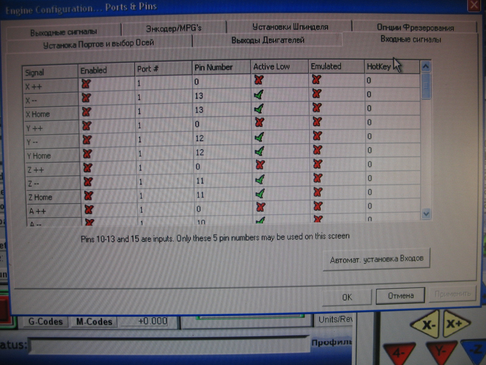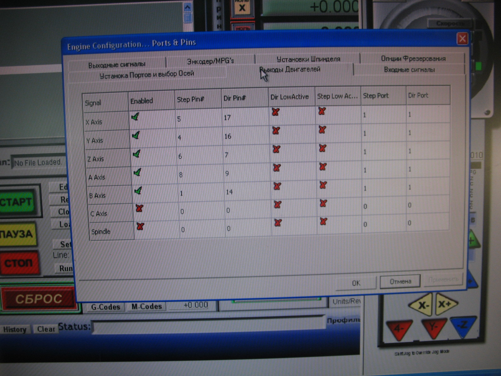Установил профиль мача для платы DXB-55 с сайта даркстона. Поотключал в настройках входящие сигналы от лимитов (мач ошибку давал, датчики еще не подключены). Пробую в ручном режиме, типа партал подвигать и ничего не происходит