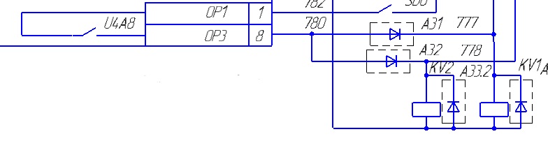 A31, A32 - диодная развязка. Чтобы реле включать не только от цепей 782 и 780, но и от других цепей (которые уходят вверх за границу рисунка), но чтобы не влиять на цепи 782 и 780