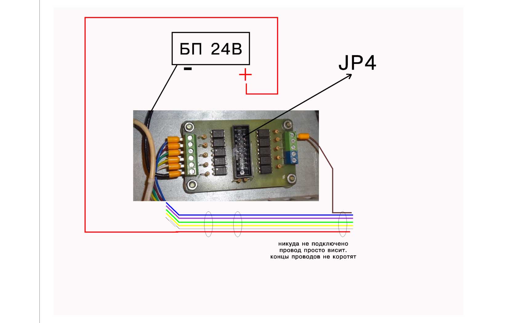 пока ничего не конфигурировал. из платки торчит многожильный кабель. в нем красный провод +24В, остальные по цветам это хвосты концевиков. замыкая красный по очереди с остальными хотел разобраться какой провод какому биту соответствует. после монтажа блока в шкаф соединю с физическими кнопками концевиков