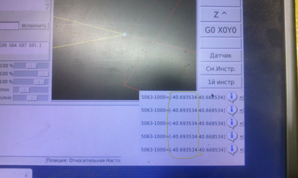 Тест выглядел так: переезд из точки смены инструмента в точку замера, замер, возврат в точку смены. Алгоритм такой, потому что лень было писать отдельную команду для экспериментов, а использовал мои стандартные процедуры измерения длины. цветом выделены результаты пяти измерений подряд, поразительное совпадение, хотя, надо признать иногда были ошибки (меньше сотки) Ошибки я списываю на механическое несовершенство моего станка.
