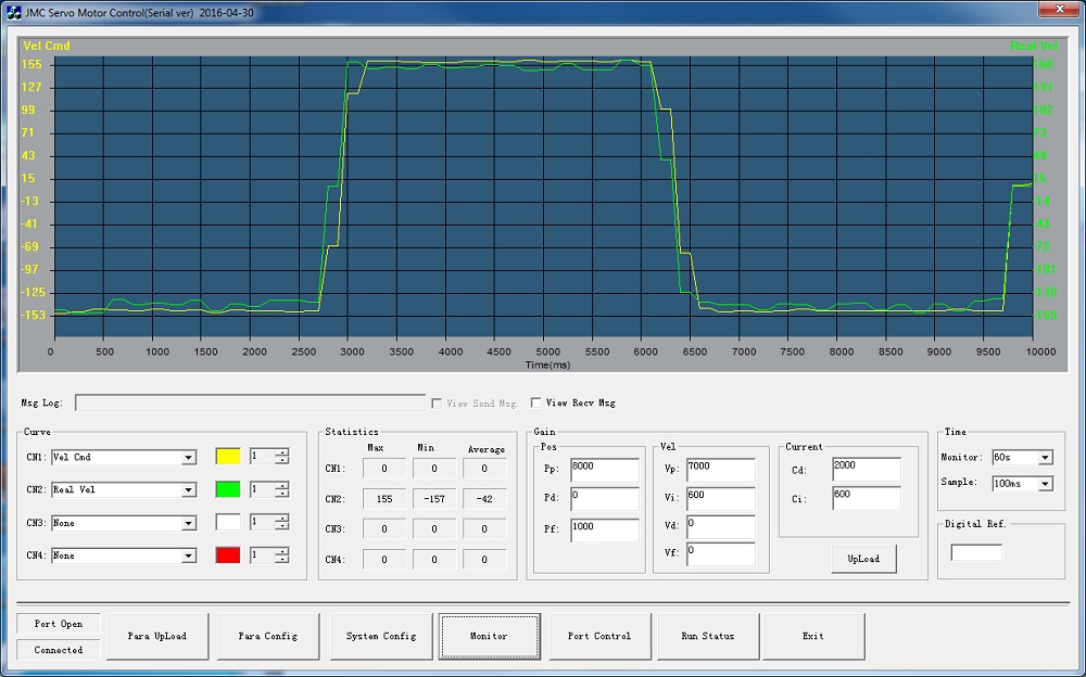Что удивительно (это мой первый опыт запуска серво-моторов), номинально все заработало. Настроечная программа соединяется с серво-контроллером, выгружает и загружает параметры. Серво двигатель отрабатывает команды позиционирования. Все очень точно и тихо.