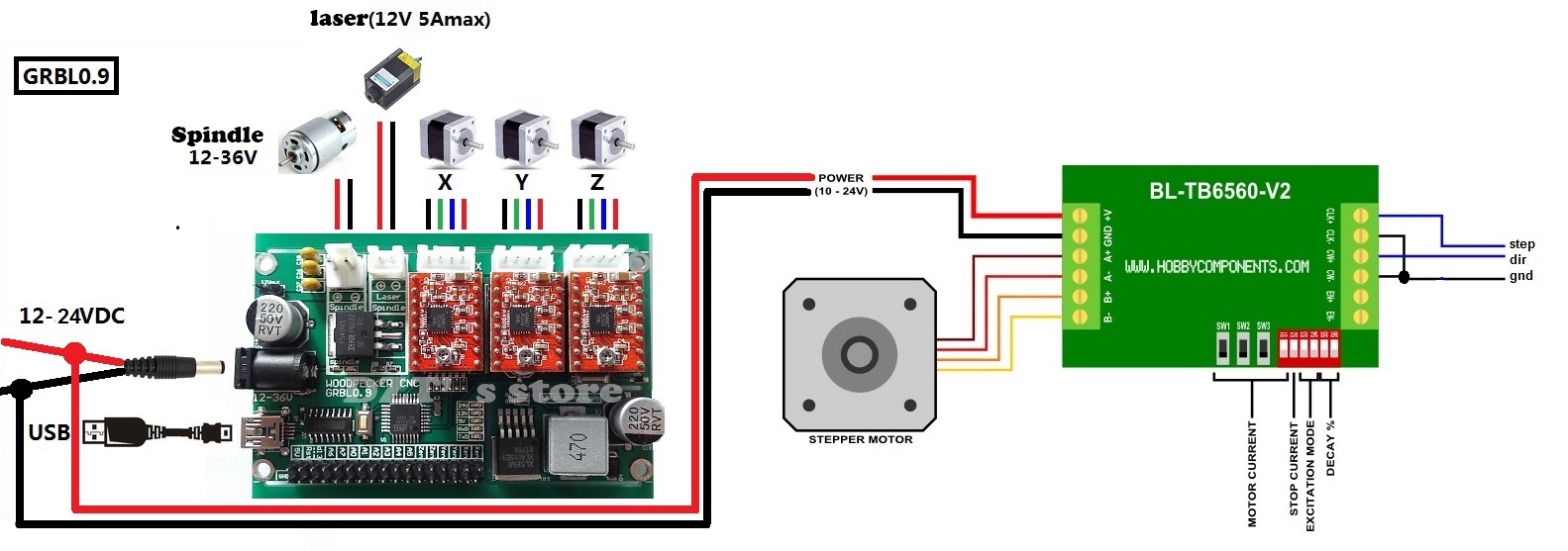 вот схемы В случае использования TB6600 в большом корпусе: В случае использования TB6600 в маленьком корпусе, вместе с Gnd еще используется +5В (не на всех экземплярах) так как плата не имеет собственного источника +5 для питания микросхемы ТВ6600 и надо изменить (инвертировать) настройки в контроллере.