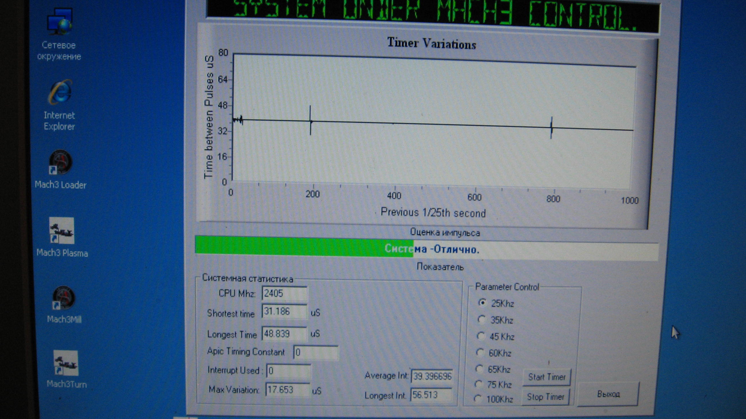 Вобщем всё заработало.В очередной раз переустановил виндос XP SP2, только на этот раз без всяких нажатий F5 вместо F6. Установил мач3, комп сам перезагрузился, появились импульсы в тесте драйвера и моторчики закрутились.