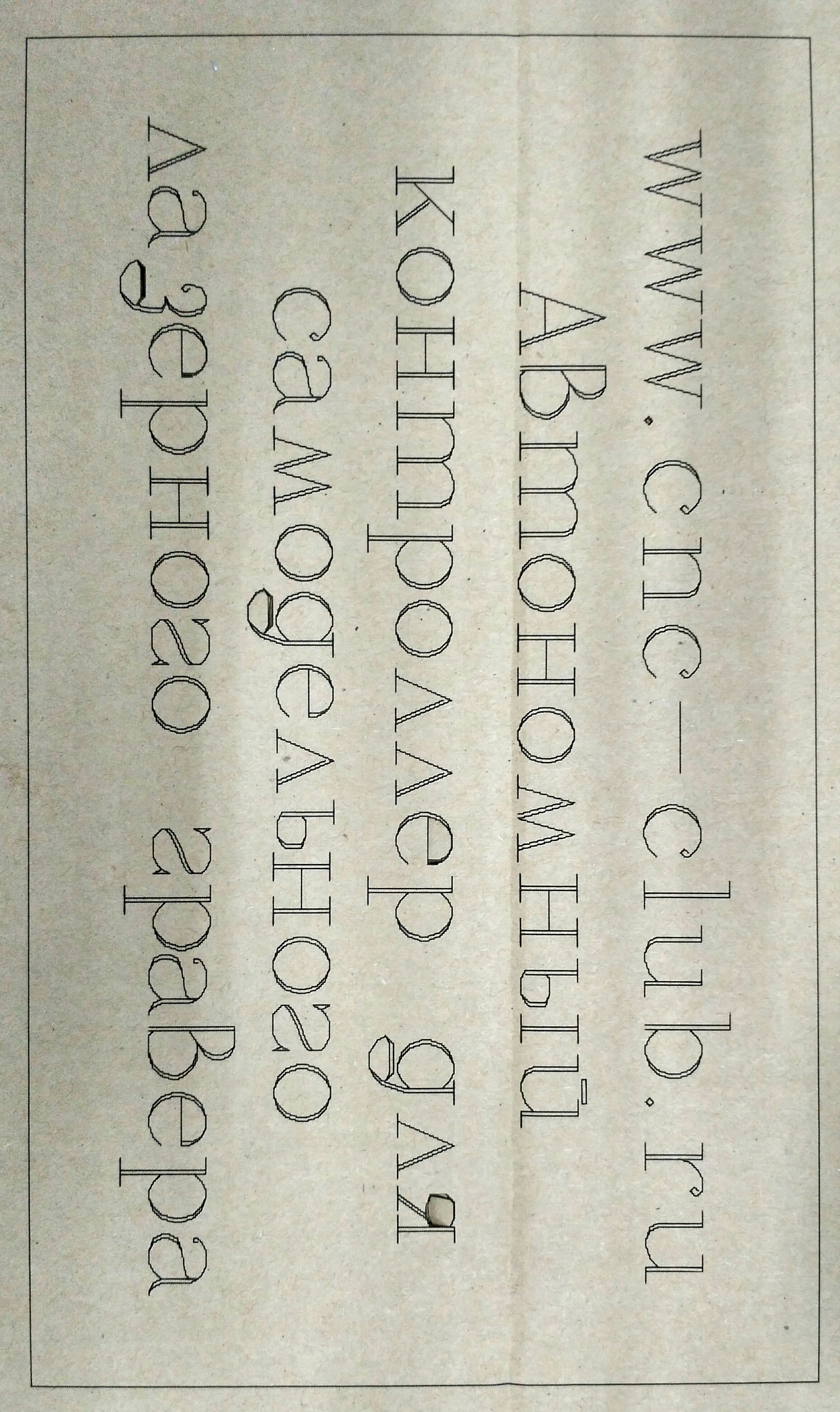 а можешь дать код программы(cnc) для эксперимента...4arus писал(а):Первое фото. Кинематика CoreXY. Это третья попытка. Скорость выжигания впечатляет фото почти А4 (275х206) - 3часа!!! Есть какие то непонятные глюки. Ну грешу на ускорение, так как контроллер перескакивает белый фон. Шд пропускают шаги. Уменьшил ускорение до 500, результат на фото, попробую ещё уменьшить. Да и фанера не айс, без какой либо обработки. Особо ничего не подготавливал и не настраивал станок видно по видео. Оси X и Y поменяны местами. Вообщем ВСЁ ДЕЛАЛОСЬ НА СКОРУЮ РУКУ. Но результат радует. Ща соберу станок с простой кинематикой буду испытывать. Автору огромный респект, и давайте поддержим.